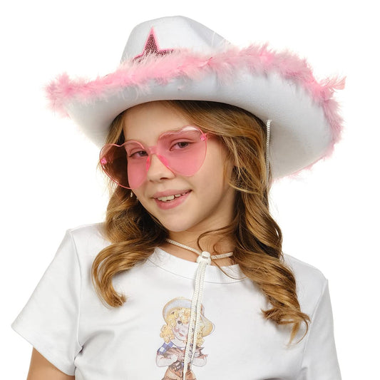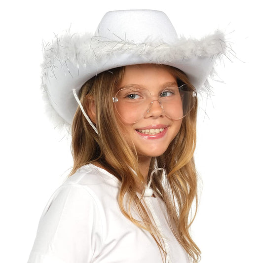 Funcredible White Cowboy Hat and Glasses - Fluffy Cowgirl Hat with Star for Girls - Cowboy Hats with Feathers - Cowgirl Accessories - Halloween Accessories for Women