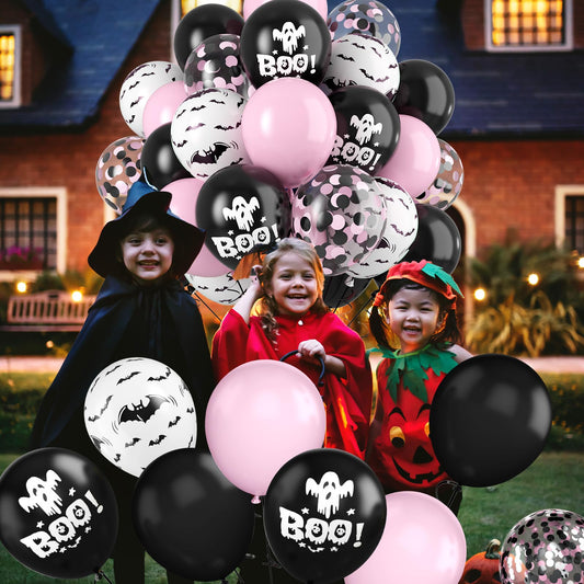 FunHot Halloween Party Balloons, 60Pcs Pink Black Halloween Balloon, 12 Inch Black Pink Confetti Balloons Bat Ghost BOO Printed Pattern Balloon with Ribbons for Kids Birthday Halloweens Decoration