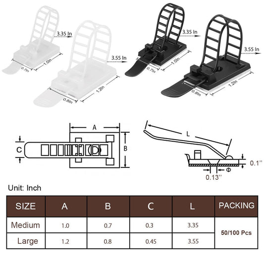 50pcs 2 Sizes Adjustable Adhesive Cable Ties Cable Clips Wire Strap Cord Clamp for Cable Management at Home and Office + 100pcs Nylon Zip Ties