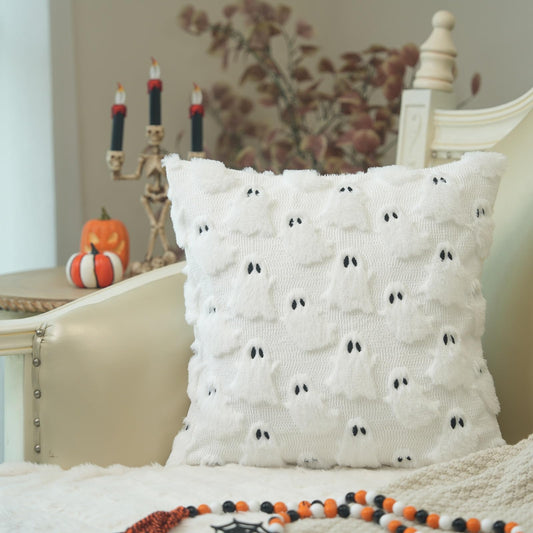 GEEORY Halloween Ghost Soft Plush Pillow Covers, 18 x 18 Inch Set of 2, Fluffy Faux Fur Wool Decorative Farmhouse Cushion Case for Sofa Home Decoration White GC026-18