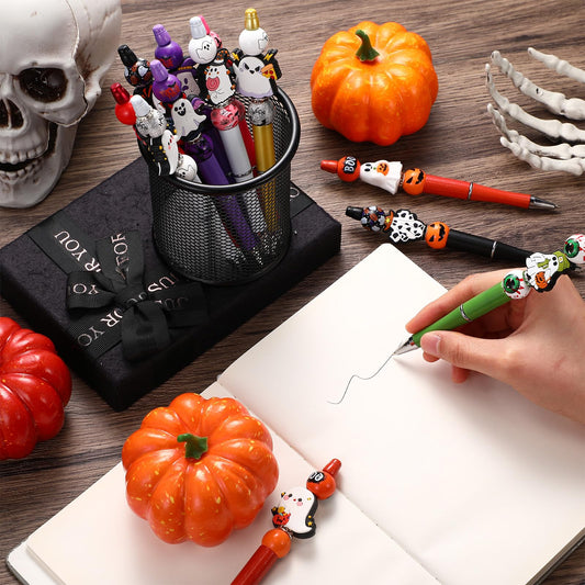 Geyee 12 Set Beadable Pens Assorted Bead Pens Wood Crystal Round Spacer Set Black Ink DIY Ballpoint for Women Men Gift Office Supplies (Multicolor,Halloween)