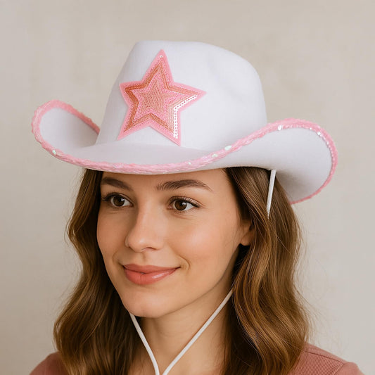 GiftExpress White Felt Cowgirl Hat with Pink Sequin Star, Country Themed Party Cowboy Dressup Play Costume Hat For Teens & Adults