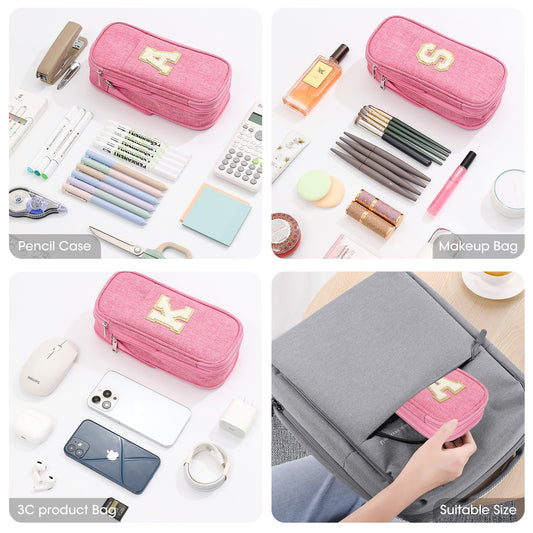 GIFTOXO Pencil Case for Girls Women, Back to School Supplies, Preppy Pencil Case, Large Initial Pencil Pouch with Zipper, Cute Pencil Bag, Aesthetic Pen Case Box for Kids Teen Girls - A(Pink)