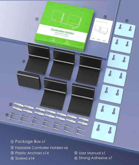 6 Pack Foldable Controller Wall Mount Holder for Xbox PS5 PS4 PS3 Switch Pro Strong Adhesive/Screw Upgraded Controller Stand Hanger with Anti-slip Pad Universal Gaming Remote, Headphone Accessories