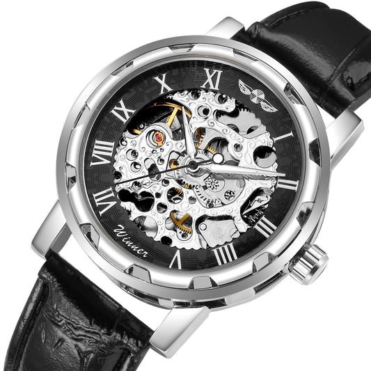 GLEIM Men's Watch, Mechanical Skeleton Steampunk Design Automatic Self-Winding Roman Numeral Silver Case PU Leather Wrist Watch