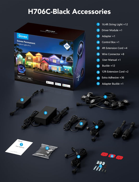 Govee Permanent Outdoor Lights Pro, 200ft with 120 RGBIC LED Lights for Daily and Accent Lighting, 75 Scene Modes for Outdoor Decor, IP67 Waterproof, Works with Alexa, Google Assistant, Matter, Black