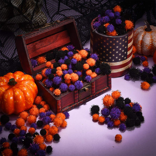 600 Assorted Glitter Pom Poms Fluffy Balls for Halloween DIY Crafts Party Decorations, 3 Colors