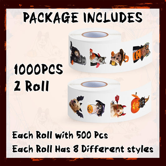 H1vojoxo Halloween Dog Stickers Roll - 1000PCS Halloween Dog Dress Up Stickers in 2 Rolls 16 Designs Pumpkin Dogs Self-Adhesive Sticker for Kids Craft Envelope Water Bottle Scrapbook Party Supplies