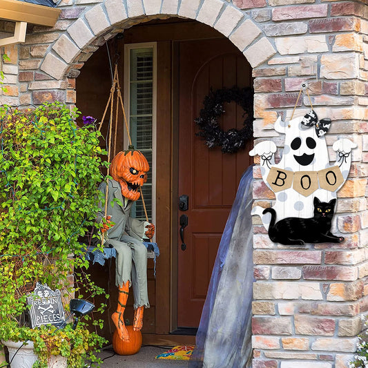 Halloween BOO Decorations Ghost Hanging Sign Front Door Hanger Wreath Decor Indoor Outdoor Yard Wall Decorations Cute Ghost Black Cat Wooden Door Sign for Halloween Party Supplies