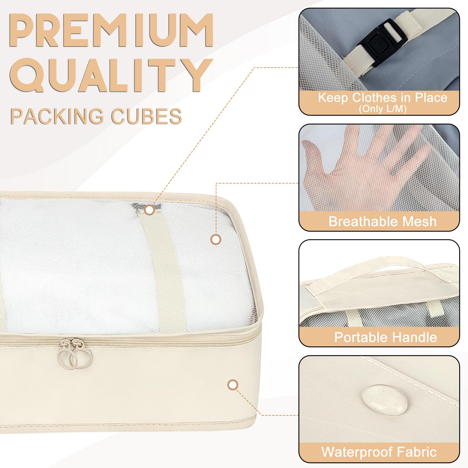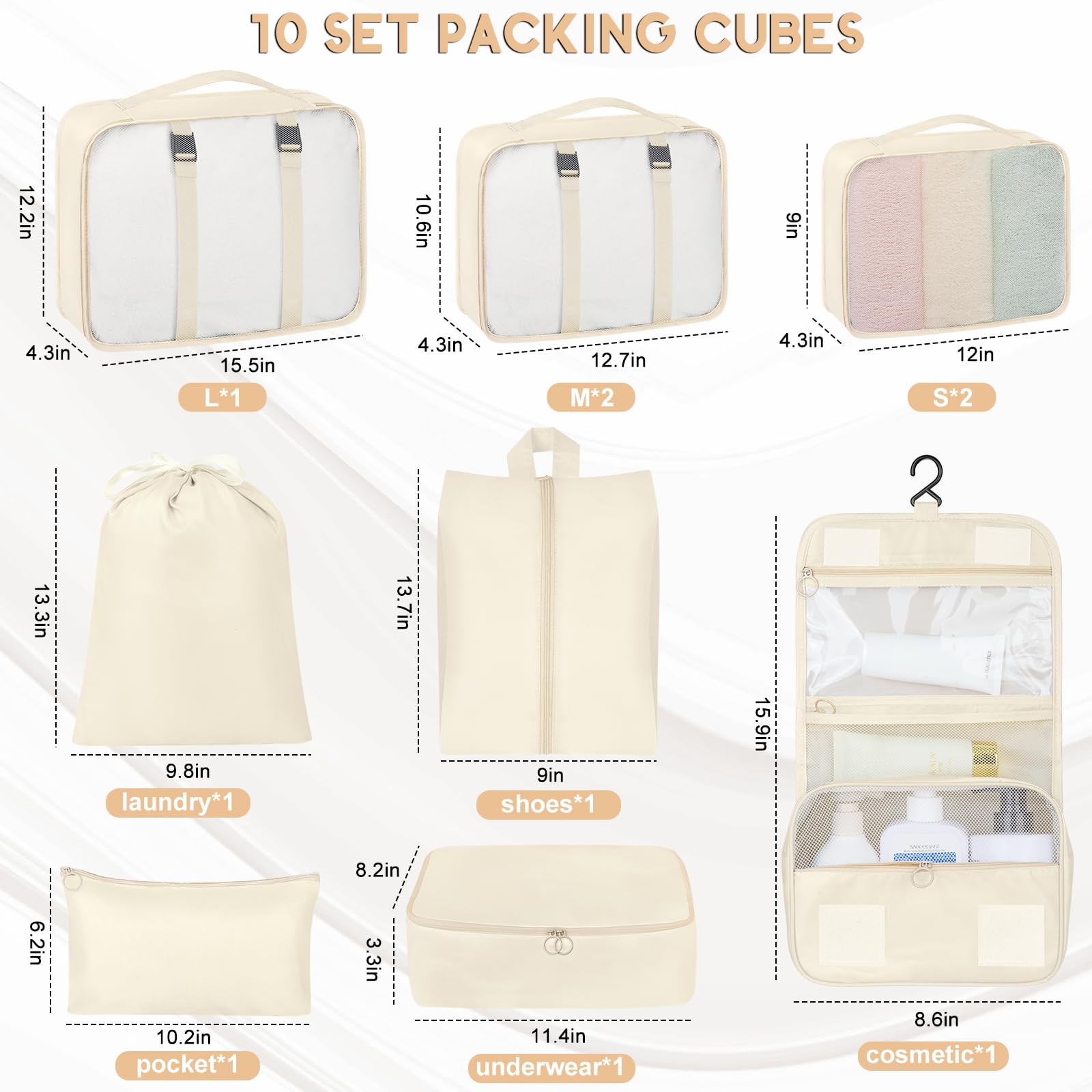 10 Set Packing Cubes for Travel, Luggage Organizer Bags with Hanging Toiletry Bag and Shoe Bag, Travel Packing Cubes for Carry on Suitcase Luggage Accessories Vacation Essentials (Beige)