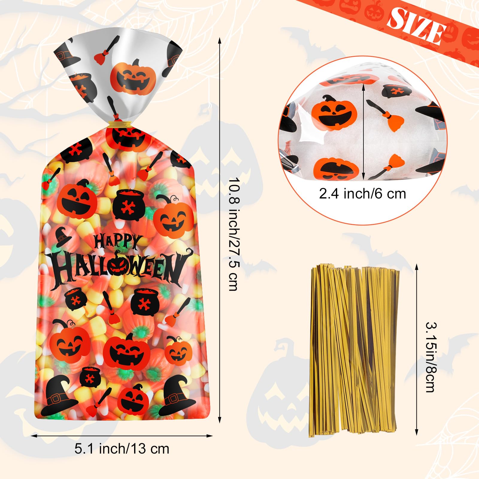 100 Pcs Halloween Treat Bags - Happy Halloweens Goodie Bag, Plastic Halloween Pumpkin Cellophane Bag Bulk, Clear Gift Goody Candy Bags with Twist Ties for Halloweens Party Supplies Favors Decorations