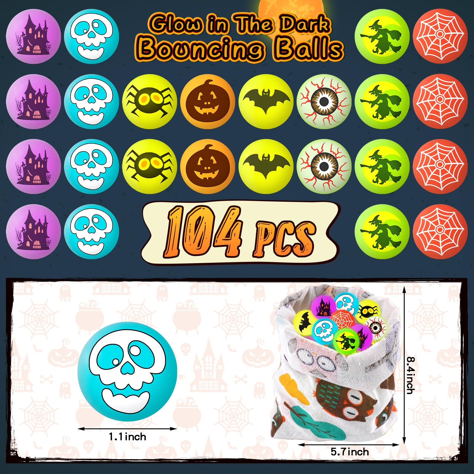 104 Pcs Glow in The Dark Halloween Bouncy Balls , 8 Halloween Designs Eyeballs Toys for Halloween Party Favor Supplies, Trick or Treating Goodie, Classroom Rewards Prizes Game for Kids- With Pouch Bag