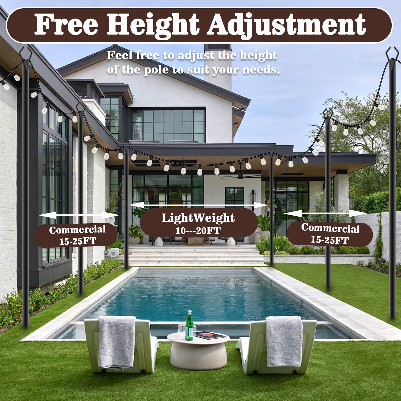 • No height restrictions:Made of high quality metal, it will not bend or wobble. The poles for string lights is not limited by its own length, and the excellent load-bearing properties allow you to install it on high fences and walls. Get rid of the general height limitation. You can also hang more number of strings of lights. Also can be applied to banners, lanterns, wind chimes, all kinds of light decoration, etc.