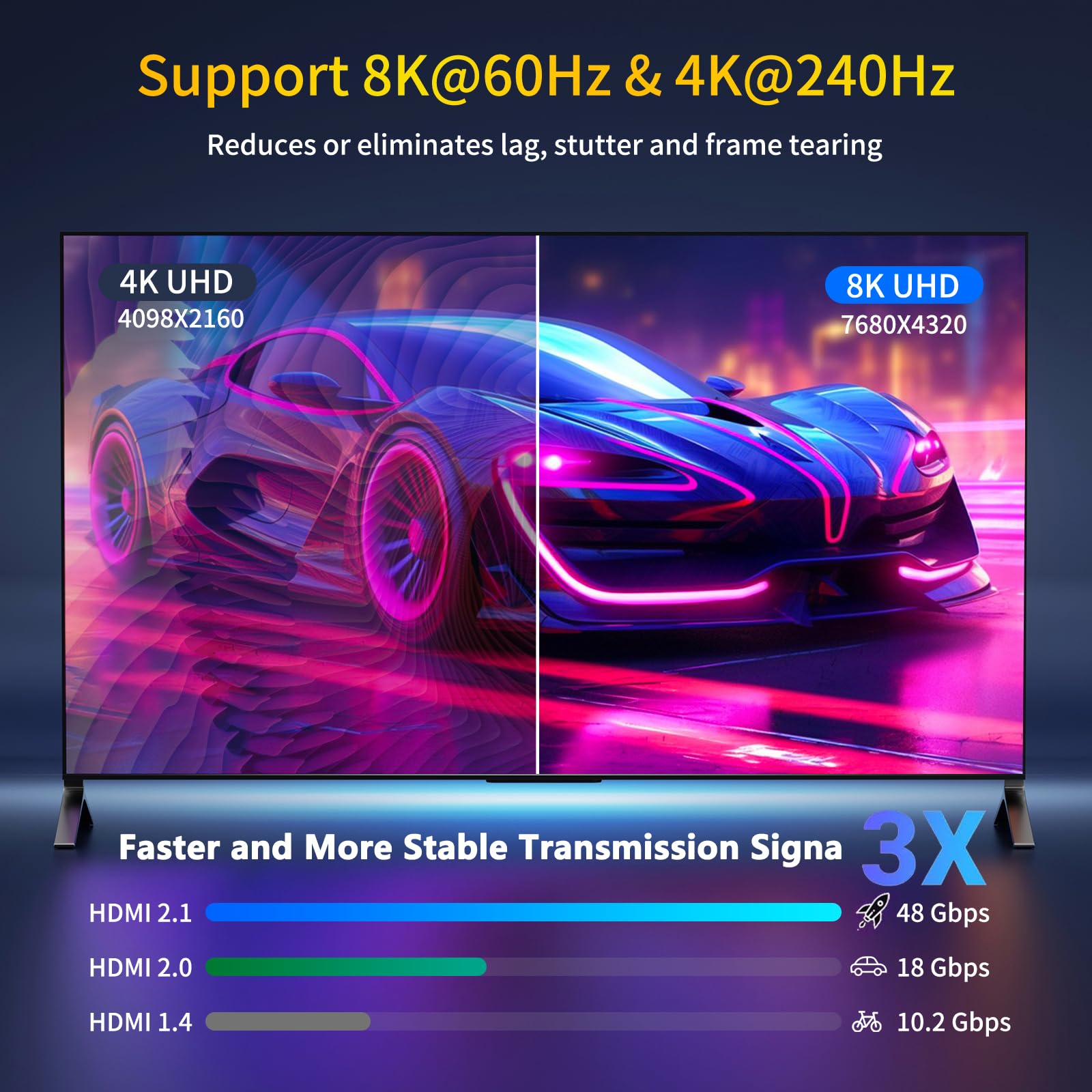 • πŸš€[ Real 8K@60HZ HDMI Cable ]: This 8K HDMI cable uses the most cutting-edge technology to accurately process every signal particle and clearly display every signal source, transfer at lightning speed. It can achieve a resolution of 7680x4320, supports high frequency 8K@60Hz, 4K@120Hz, 8K unique and upgraded HDR, EARC, VRR and 12-bit color processing technology, and has a higher level of improvement in audio and color, video Scenes, 3D scenes are more realistic!