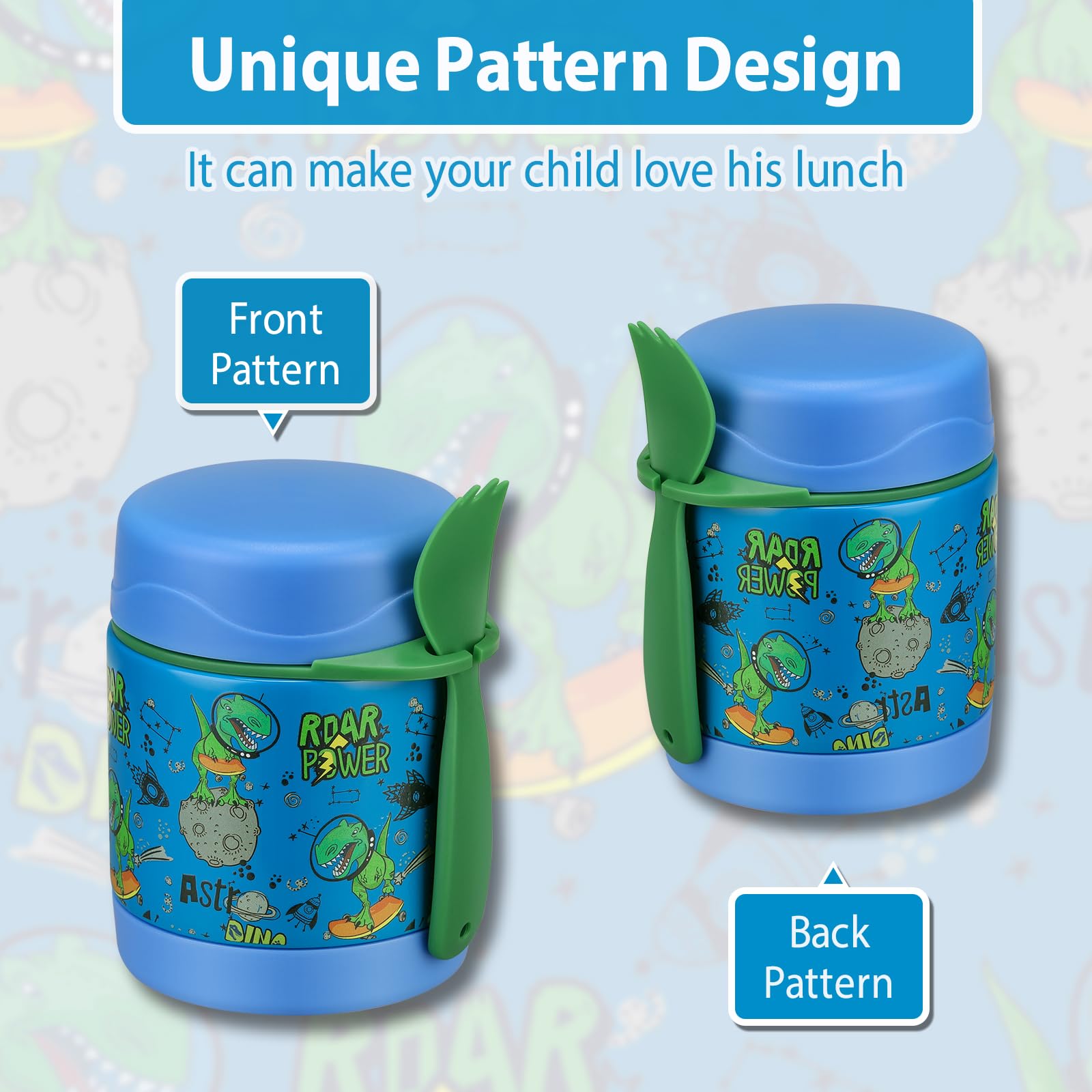 10oz Soup Thermo for Hot Food Kids,Lunch Thermo Kids Food Jar with Spoon Hot Insulated Food Containers,Leak Proof Stainless Steel Wide Mouth Lunch Food Thermo Jar for School(Blue-Dinosaur)