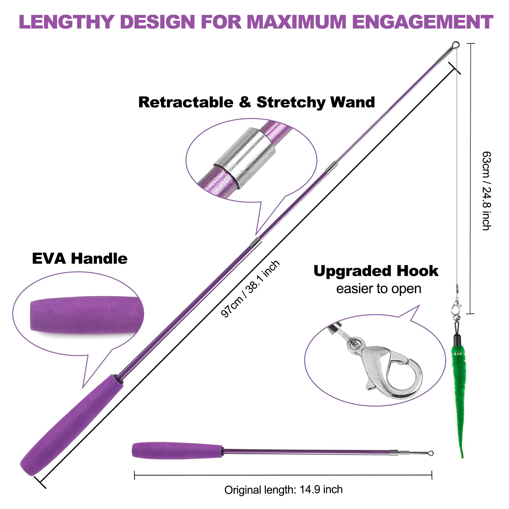 • 【Retractable Cat Wand】: The cat toy wand can extend from 15' in to 38.3', covering lots of play space. It's very light, flexible, durable and easy to store. The foam handle makes your hands more comfortable and make it possible to play a longer time without getting you tired. It’s a new start for cat teasing!