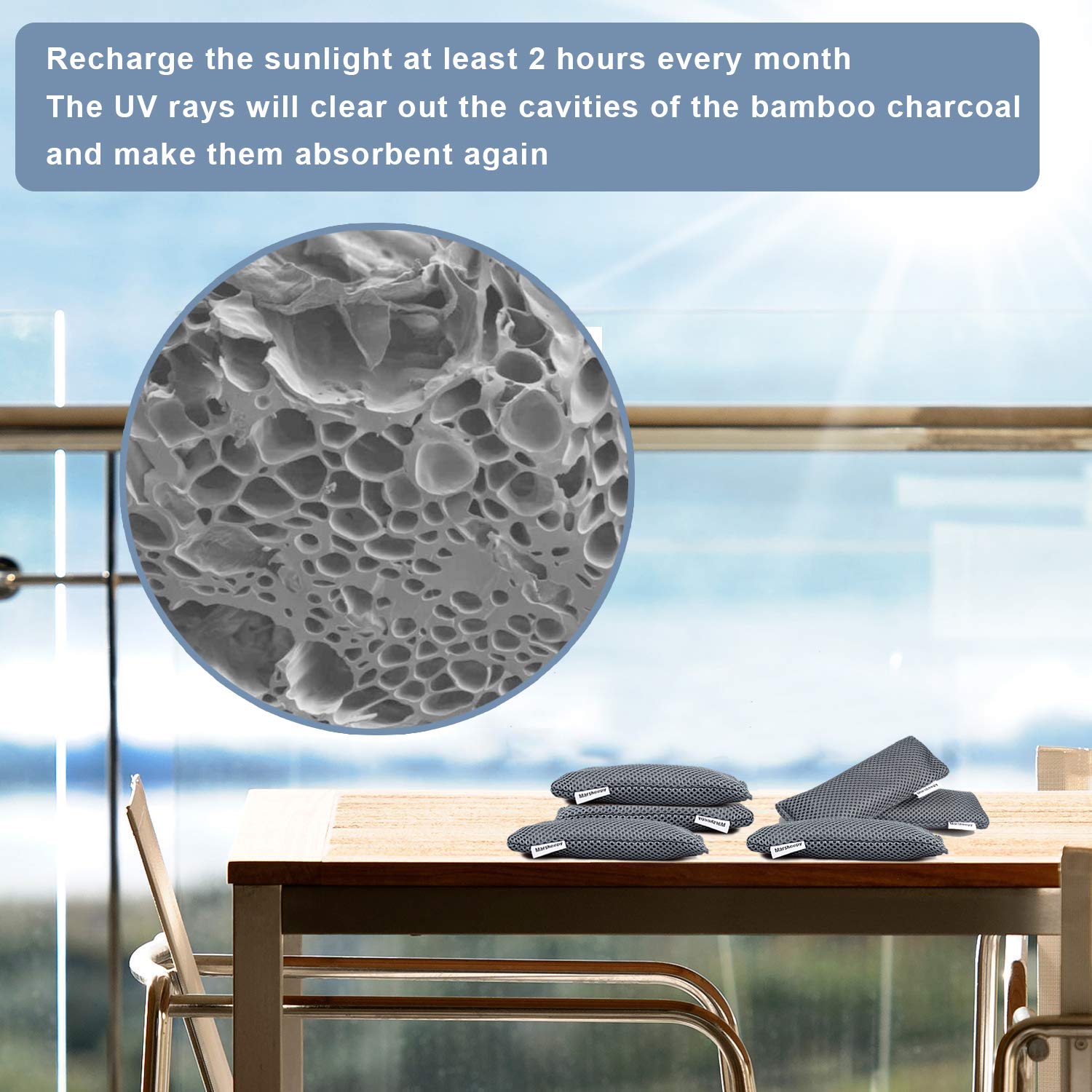 • Perfect for Any Where- The incredibly powerful type of bamboo charcoal has millions of tiny little pores and cavities that work together to clean the air and absorb excess moisture; perfect to be the car odor absorber bags, closet deodorizer, gym bag deodorizer,or simply place in your refrigerator, bathroom and pet litter box areas;