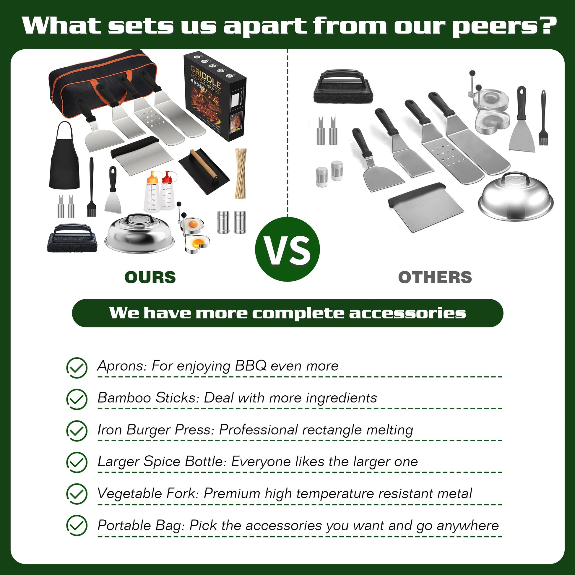 • 【Premium Quality】: Our Furnhome 120pcs Griddle Accessories Kit is crafted with heavy gauge stainless steel, ensuring durability and long-lasting performance. You can trust that our BPA-free, rust-resistant, and durable tools won't crack or melt with long-term use. Say goodbye to flimsy tools that bend or break easily during outdoor grilling sessions.