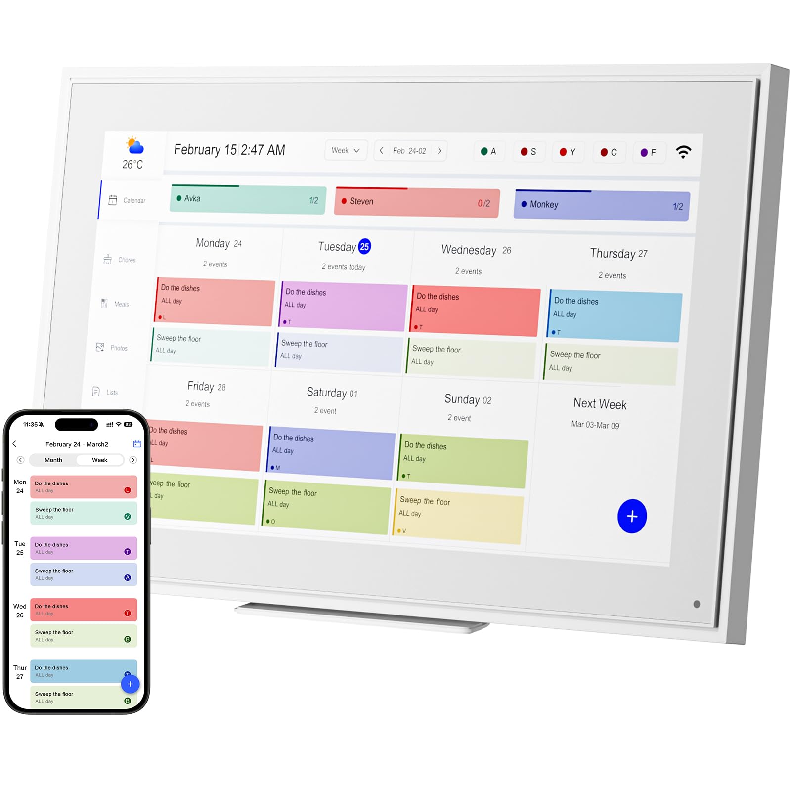 • โœ”๏ธ๐€๐ฅ๐ฅ-๐ˆ๐ง-๐Ž๐ง๐ž ๐’๐ฆ๐š๐ซ๐ญ ๐…๐š๐ฆ๐ข๐ฅ๐ฒ ๐‚๐š๐ฅ๐ž๐ง๐๐š๐ซ: WiFi-connected touch digital calendar combined with a digital planner ,the crystal-clear 15.6' FHD touchscreen with chore chart and to do list notepad, generates the whole new calendar, which makes your family organized and stays every schedule on track. Assign unique colors and chores to each family member,making family scheduling simpler and more intuitive.Ideal gift for students,mom,lover,grandparents,parter,colleague,professionals, and families..