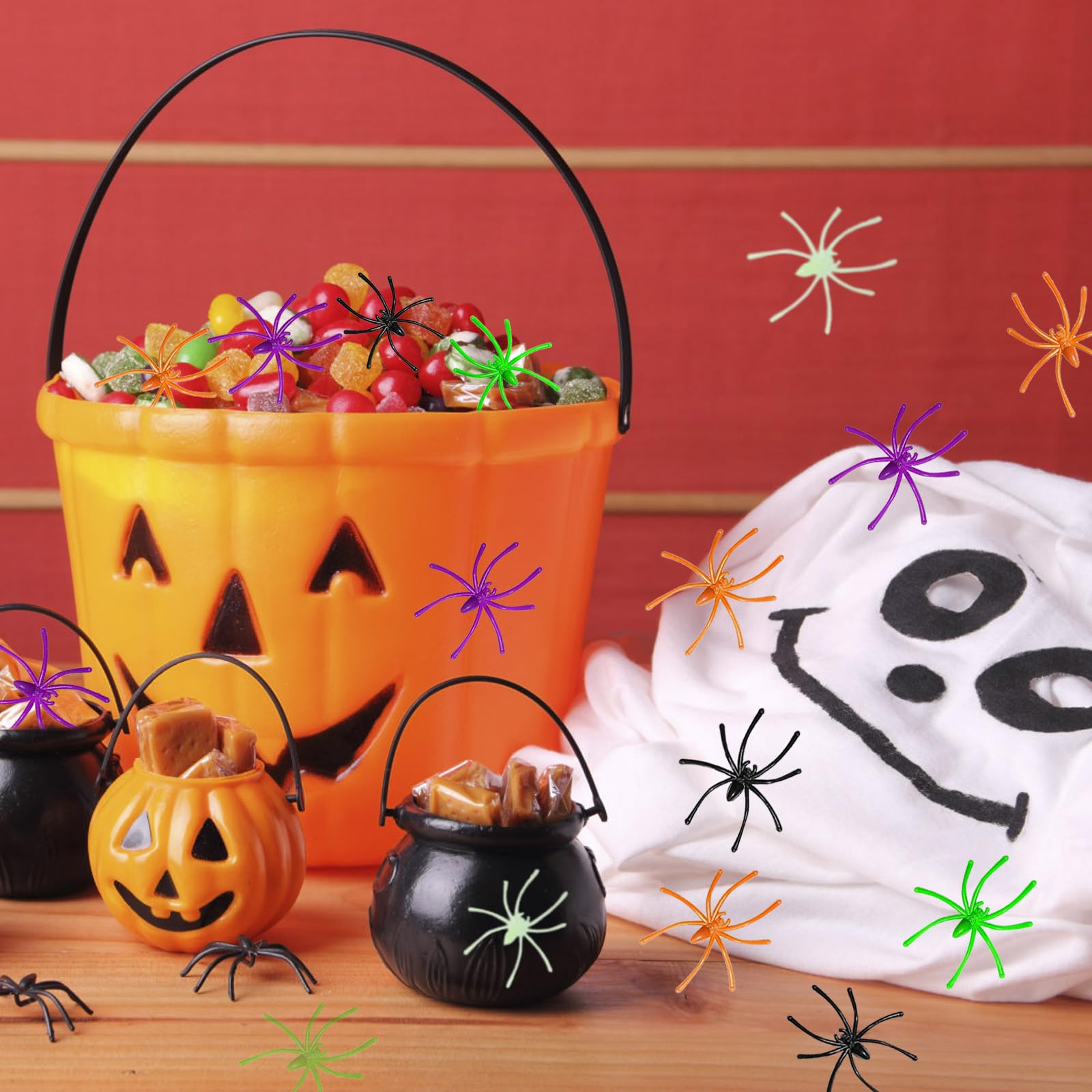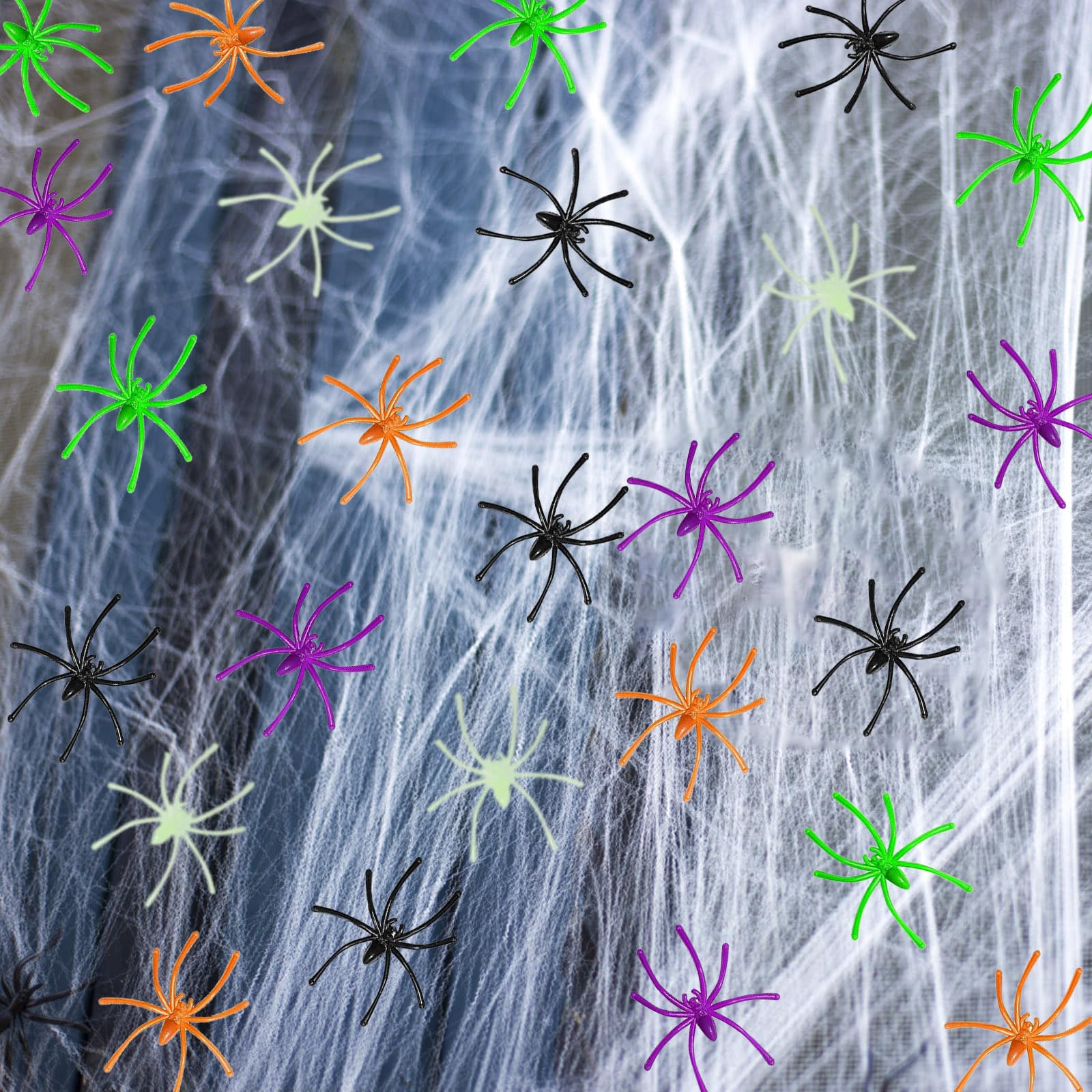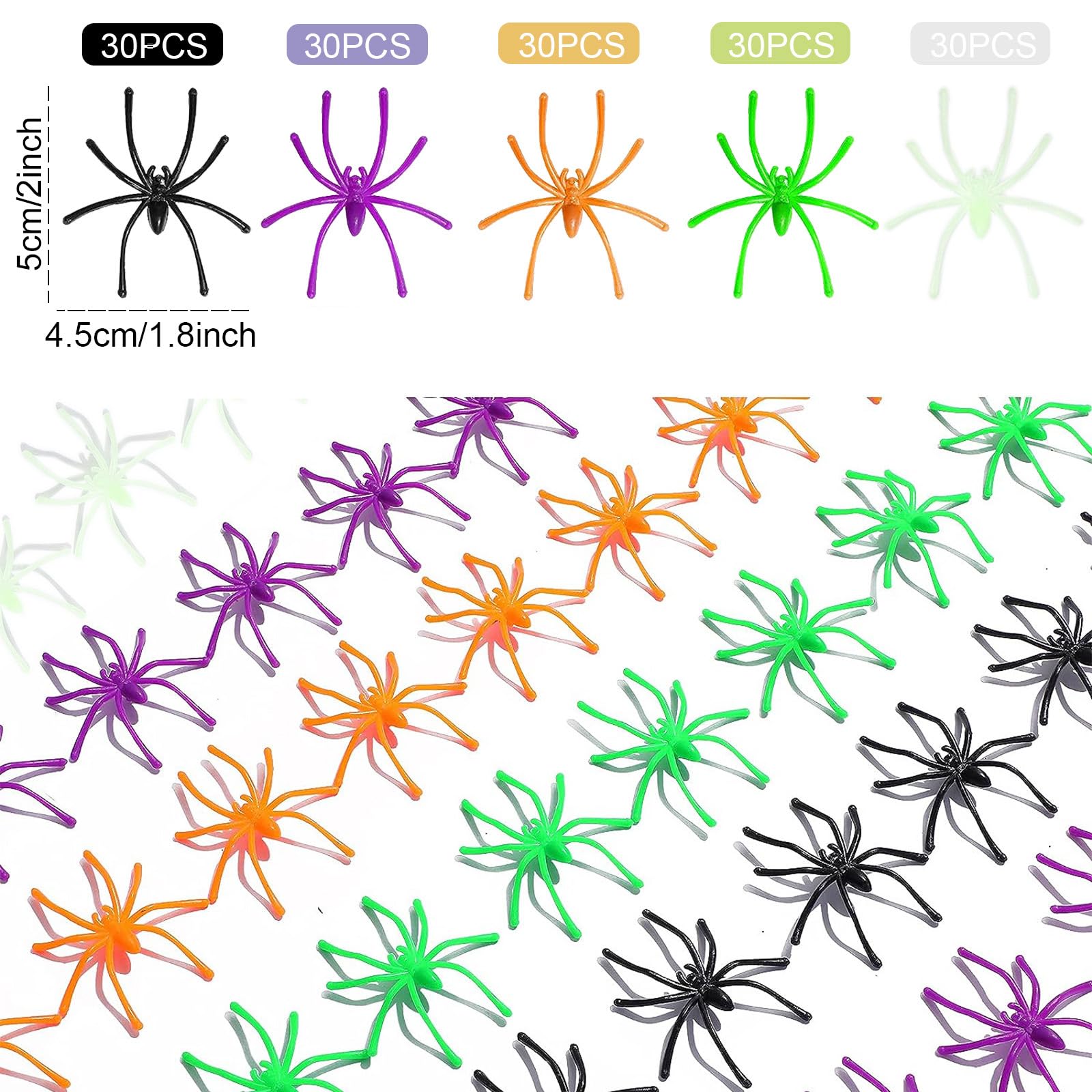 Mini Plastic Spiders Material These Halloween spider decorations are made of non-toxic and durable plastic, light in weight, easy to carry and use. Includes 5 different colored spiders(Black, Green, Orange, Purple, Glow in the Dark Spiders) for your different Halloween party decoration or prank game needs.
