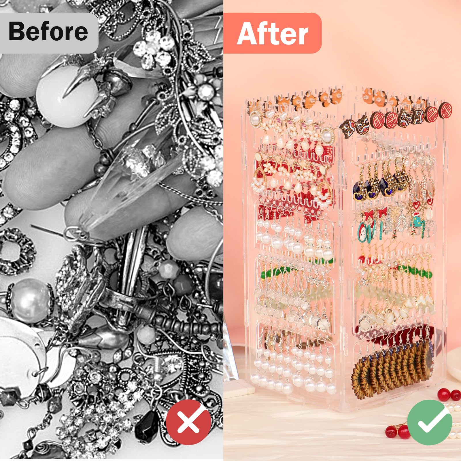• 【228-Holes Earring Storage Organizer】:Clear jewelry organizer stand with 228 holes for stud and hook earrings.It can hold 114 pairs of small earrings.Top 3 tiers hold studs and short dangle earrings,bottom 2 tiers hold long dangle earrings