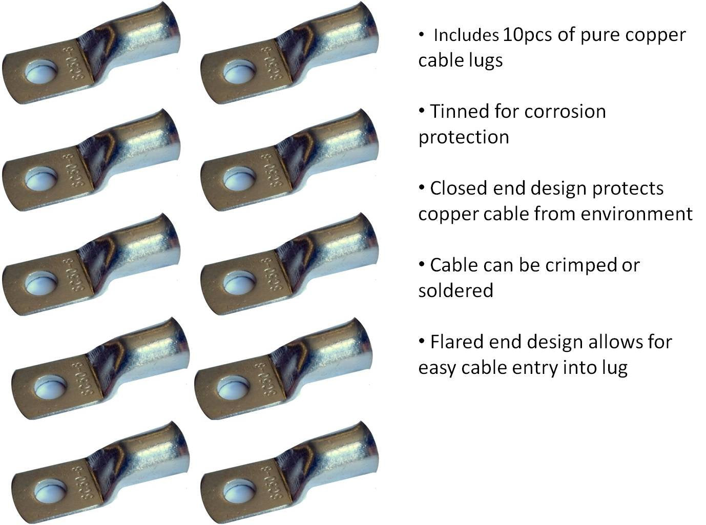 • Cable Lug Specifications: pure copper, tinned for corrosion protection (excellent for outdoor and marine applications), closed end design to protect cable from outdoor environment, wire can be crimped or soldered, excellent conductivity characteristics, flared barrel end for easy entry of cable.