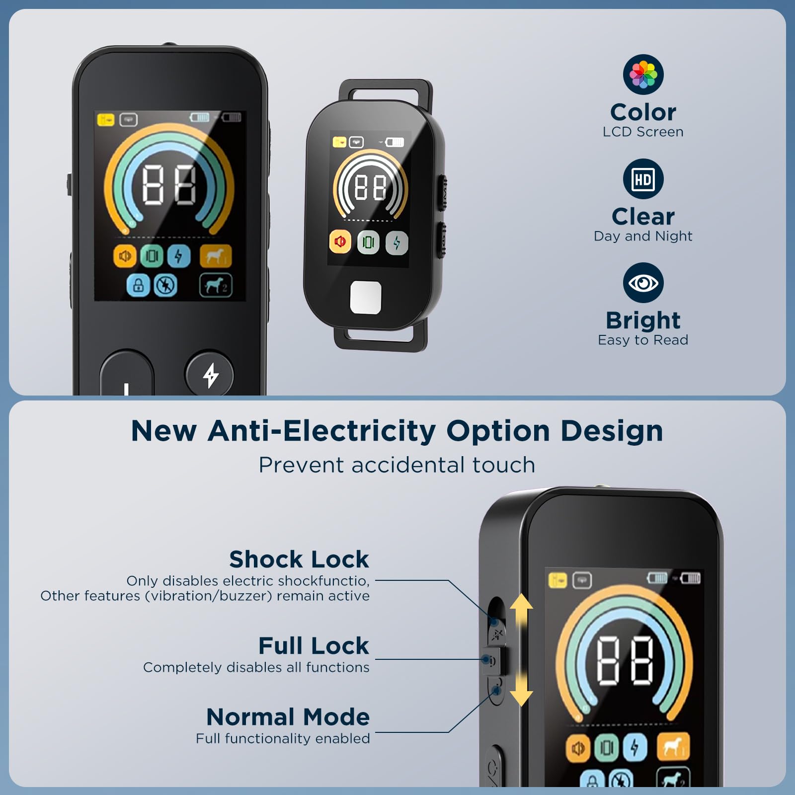 • New Shock Lock Desin and IP67 Waterproof - Safety Lock Mode disables Shock Mode while keeping beep & vibration, preventing accidental shocks. The IP67 waterproof receiver works reliably in all weather conditions for worry-free training.