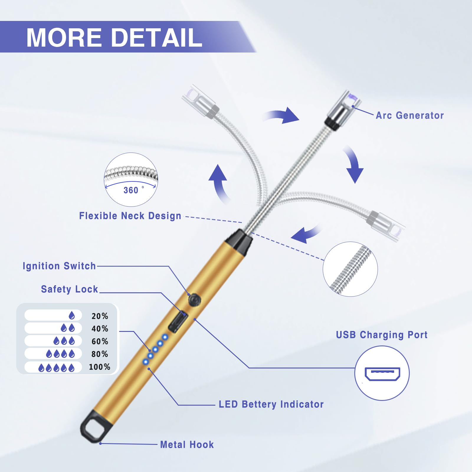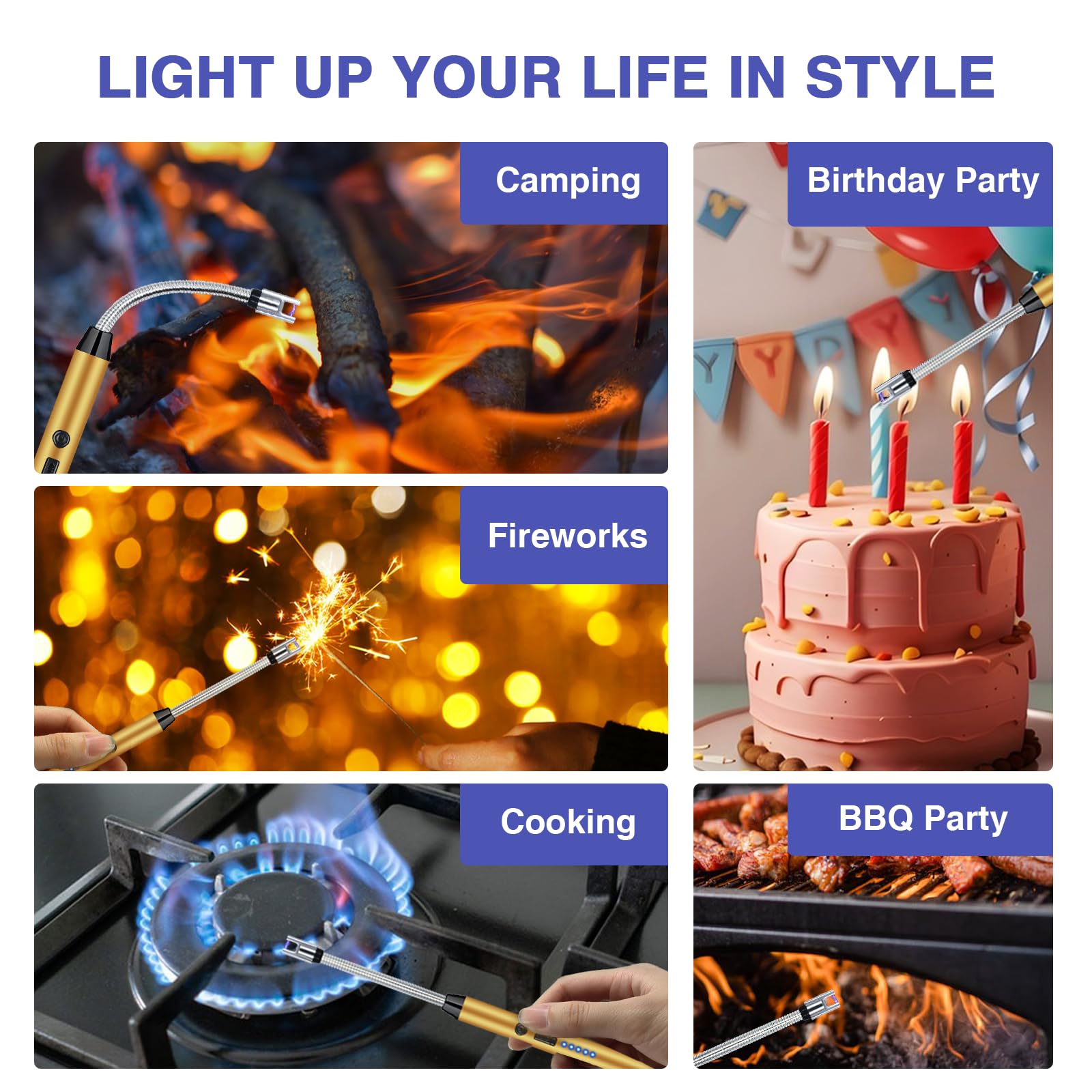 • [BRING YOU A HIGHER QUALITY LIFE]--This USB rechargeable lighter give you a higher quality of life, as it does not produce pungent gases and is compact and portable. Meanwhile, the windproof design makes it unaffected by rain, snow, strong winds and other inclement weather, electric lighter perfect for outdoor, camping, barbecue.The 360 ° flexible rotating long neck design reduces unnecessary worries by lighting aromatherapy, candles, and fireplaces in daily life.