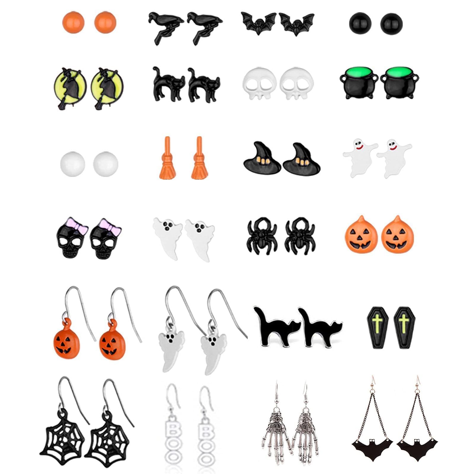 24 Pairs Halloween Earrings for Women Bat Witch Cat Earrings Set Spider Web Pumpkin Skull Dangle Earring Halloween Jewelry Accessories Costumes
