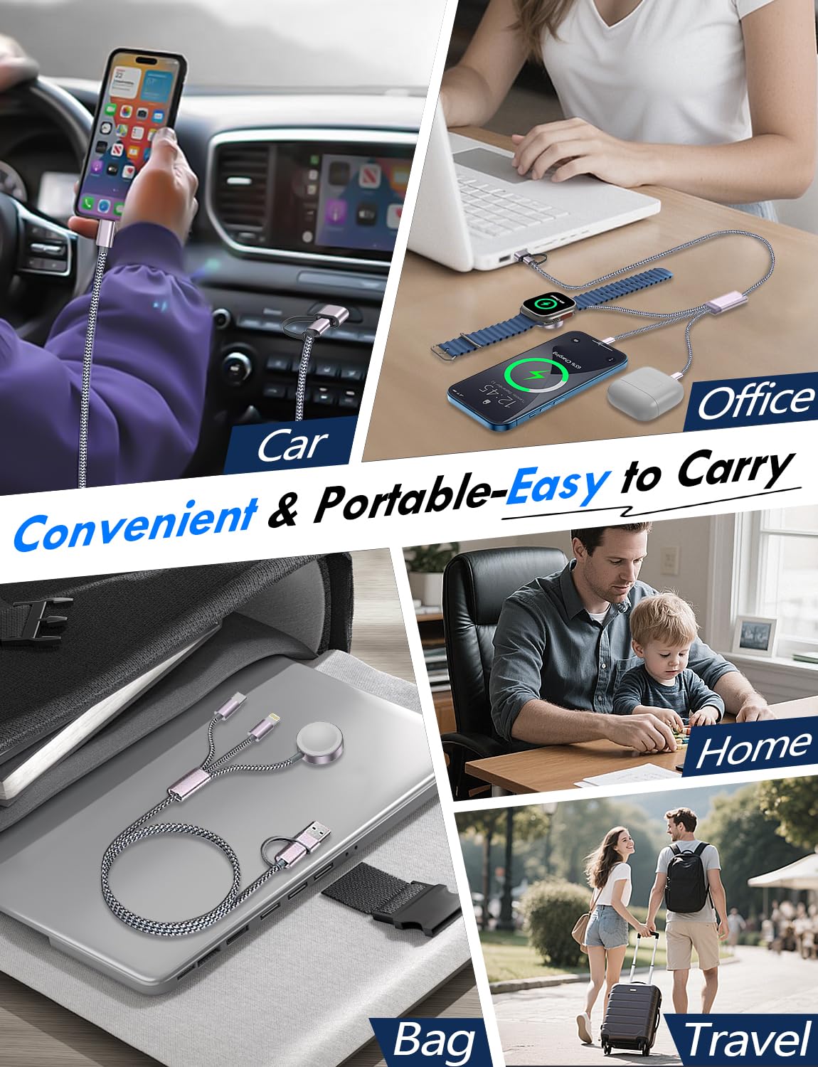 • 【Portable Travel Camping Essentials&Car accessories】This 1.25M/4ft 3 in 2 charging cable is convenient to carry around with lightweight and portable design.It fits seamlessly into travel vocation essentials like bags and suitcases so it is a perfect choice when going on holiday,business trip,travel,office,dorm life,apartment living, college campuses,and hiking adventures. Ideal for charging in car,Charge iPhone, iWatch, and USB A to C cable-compatible devices simultaneously—no adapters needed.