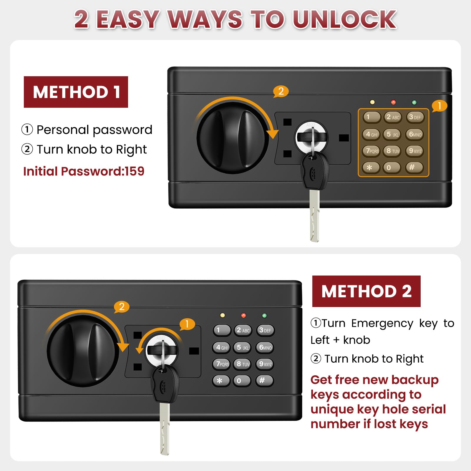 • 【2 WAYS TO UNLOCK】: ①Personal code/master code+turning knob. ②Emergency keys+turning knob.The first time you get the safe, please use the key to open the door. (Attention: Don't keep the emergency keys in the safe. If you forget the password, you will not be able to open it)