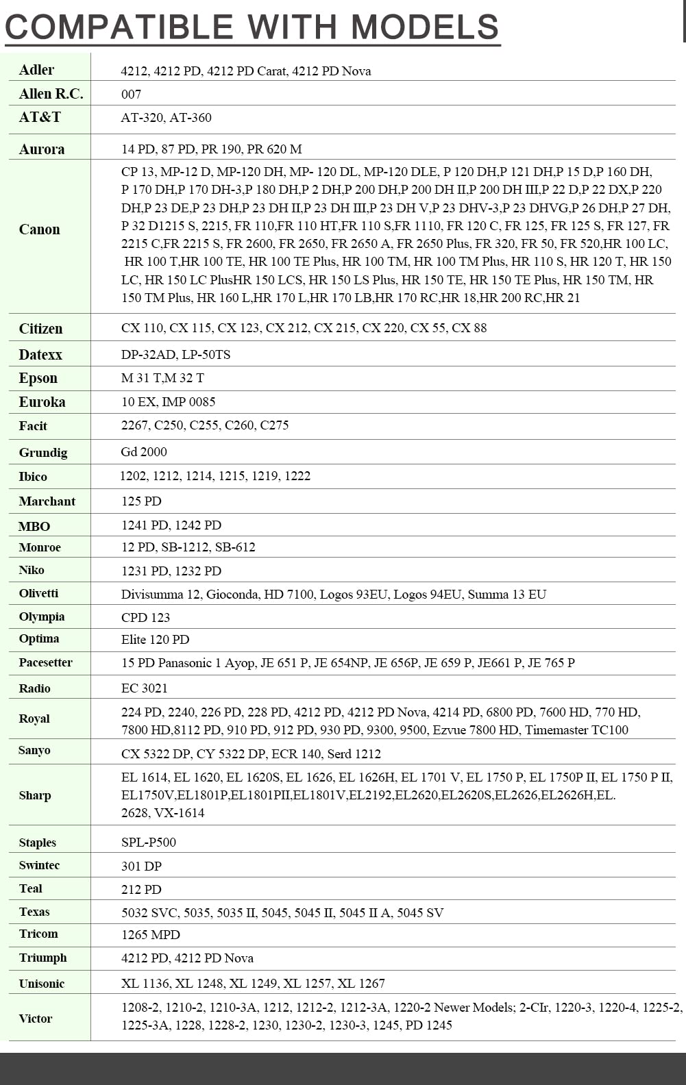 Details: Compatible with most models- Compatible with Casio:1215S/FR1110/FR120C/FR125/FR125/FR2215/FR2215S/FR2600/FR2650/FR2650A/FR2650Plus/FR 320/FR 50/FR 520/HR 100 LC/HR100T/ HR100TE/HR100TE Plus/HR100TM/HR100TM Plus/HR110S/HR120T/HR150LC/HR 150LC Plus/HR150 LCS/HR150TE/HR150TE Plus/HR150TM/HR150 TM Plus/HR160L/HR170L/HR170LB/HR 18 Compatible with Canon: CP13/ MP-12D/ MP-120DH/MP-120DL/MP-120DLE/P120DH/P121DH/P15D/P160DH/P2DH/P200DH/P200DHII/P200DHIII/P22D/P22DX/P220DH/P23DE/P23DH/P23DHII/P23DHIII/P23DHV/P23DHVG/ Compatible with Sharp: EL1614/EL 1620 S/EL 1626/EL 1626 H/EL 1750 P/EL 1750 P II/ EL1750 V/EL1801 P/EL 1801 P III/EL 1801 V/EL 2192/EL 2620/EL 2620 S/EL 2626/ EL 2626 H/EL 2628EL-1750V/EL-1801V Compatible with Victor:1208-2/1210-2/1210-3A/1212/1212-2/1220-2/1220-3/1220-4/1225-2/1228/1228-2 /1230/1230-2/1230-3/1245 Compatible with Texas Instruments:5032 SVC/5035/5035 II/5045/5045 II/5045 SV Compatible with Adler:4212/4212 PD/4212 PD Carat/4212 PD/R C 007 Compatible with Aurora:14 PD/87 PD/PR 190/ Compatible with Citizen:CX 110/CX115/CX 123/CX 215/CX 220/CX 55/CX 88 Compatible with Epson:M 31 T/ M 32 T Compatible with Euroka:10 EX/IMP 0085 Compatible with Facit:2267/C250/C255/C260/C275 Compatible with Grundig Gd 2000 Compatible with Ibico :1202/1214/1215/1219/1222 Compatible with Marchant 125 PD Compatible with MBO :1241 PD/1242 PD Compatible with Monroe:12 PD/SB-1212/SB-612 Compatible with Niko: 1231 PD/1232 Compatible with Swintec : 301 DP/Teal 212 PD Compatible with Texas Instruments : 5032 SVC/5035/5035 II/5045/5045 II/5045 II A/5045 SV Compatible with Tricom : 1265 MPD/ Adler 4212 PD Compatible with Unisonic : XL 1136/XL 1248/XL 1249/XL 1257/XL 1267 two color ink roller print calculator Can be used instead of CP13 / NR42 Package includes: 3 x IR-40T Ink ribbon (3 Pack)