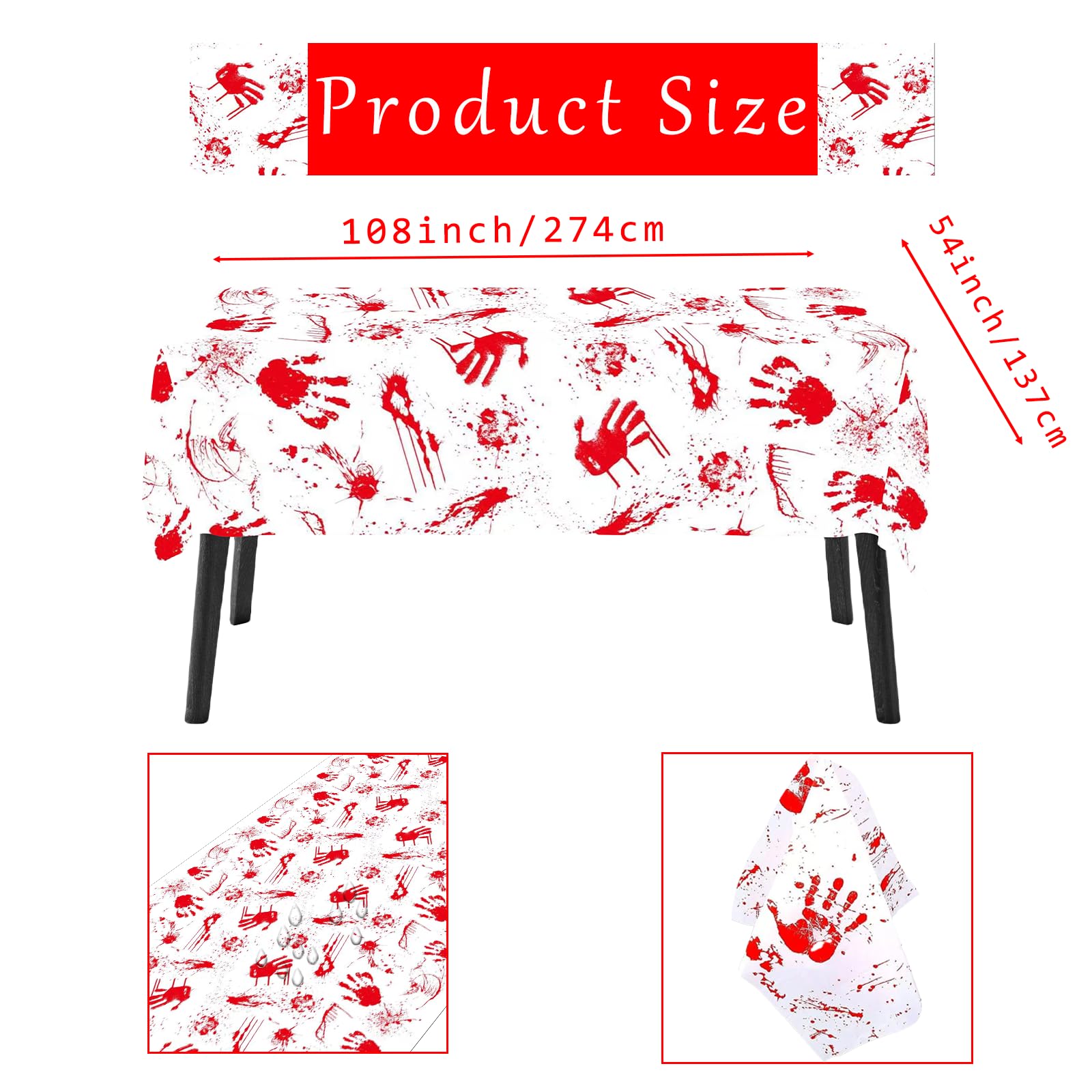 • BLOOD SPLATTER DESIGN: Featuring realistic red handprints and blood splatter patterns, each table cover adds a spooky and thrilling touch to your party decor. Perfect for creating a creepy atmosphere at your Halloween or horror-themed event.