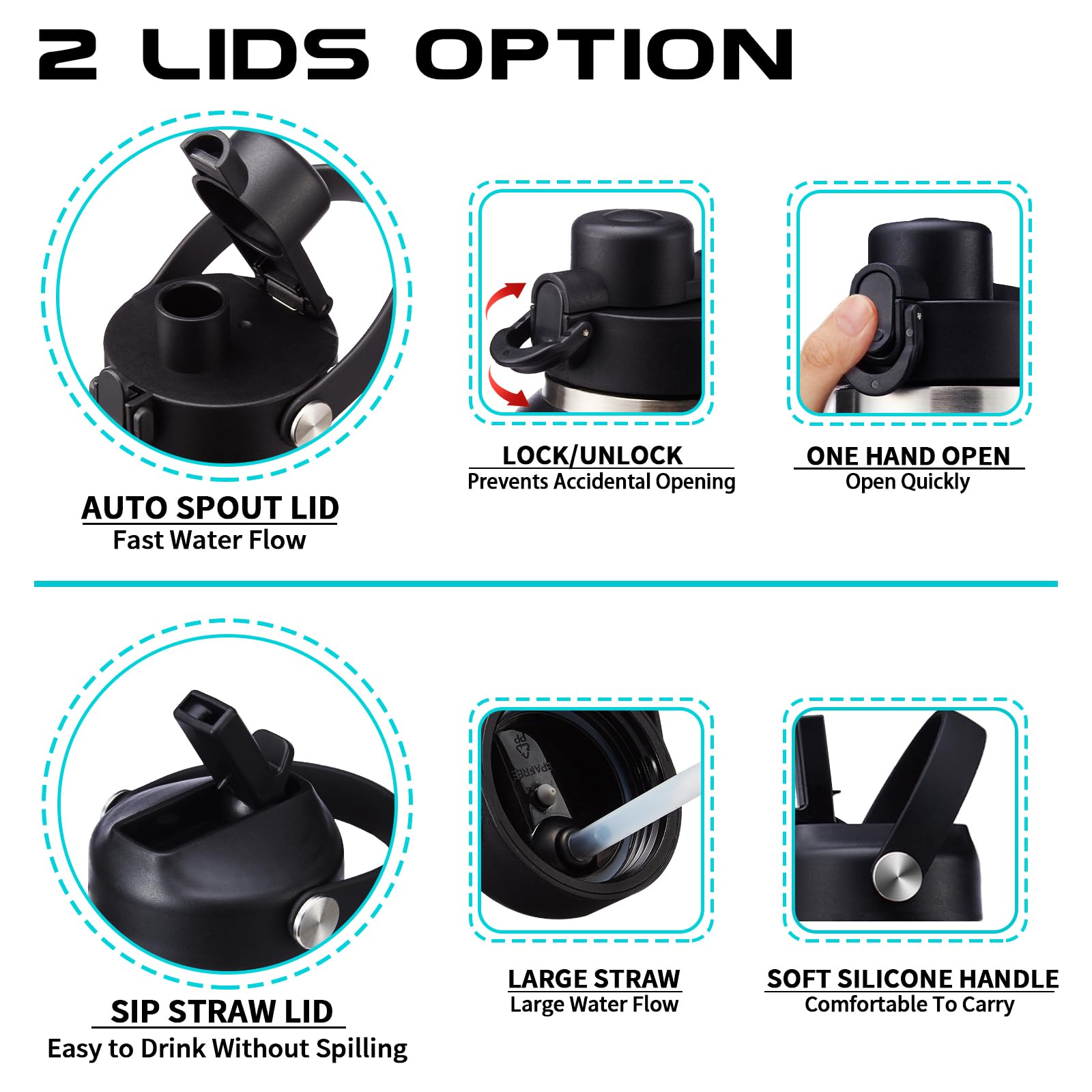 • √ LEAKPROOF STRAW & CHUG LIDS (Real Sealed): Every water bottle come with 1pcs splash-resistant Press-In straw lid, and 1pcs POP-UP spout chug lid which with a button lock. Both BPA-free, leak-proof and one-hand control design.