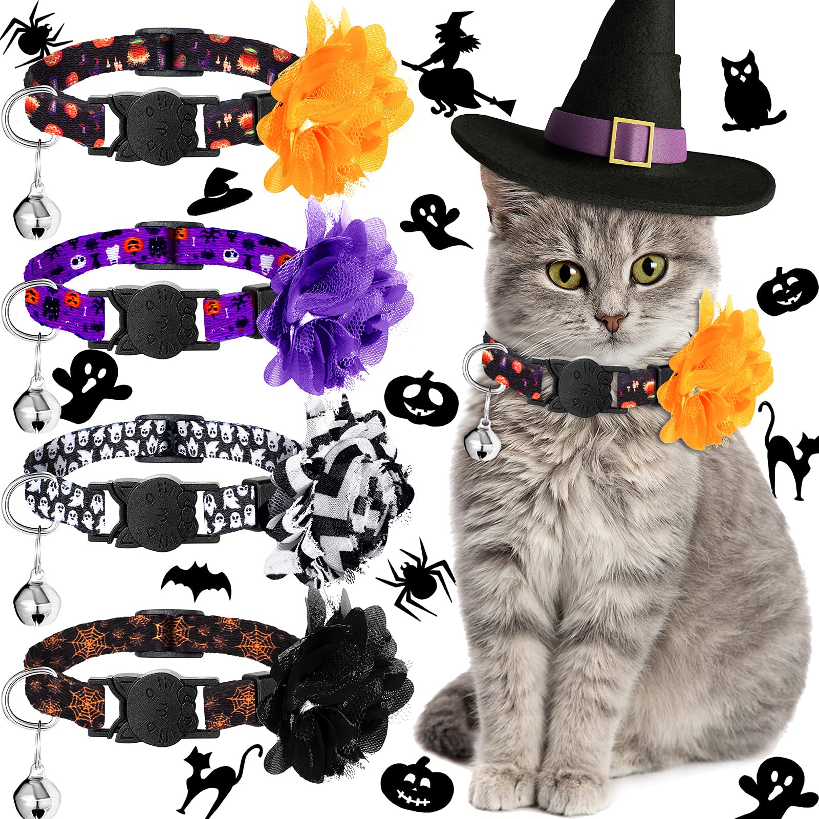 4 Pieces Halloween Cat Collar Breakaway Cat Collars with Bell and Removable Flowers Pumpkin Ghost Kitty Collars Quick Release Adjustable Pet Collar for Cat