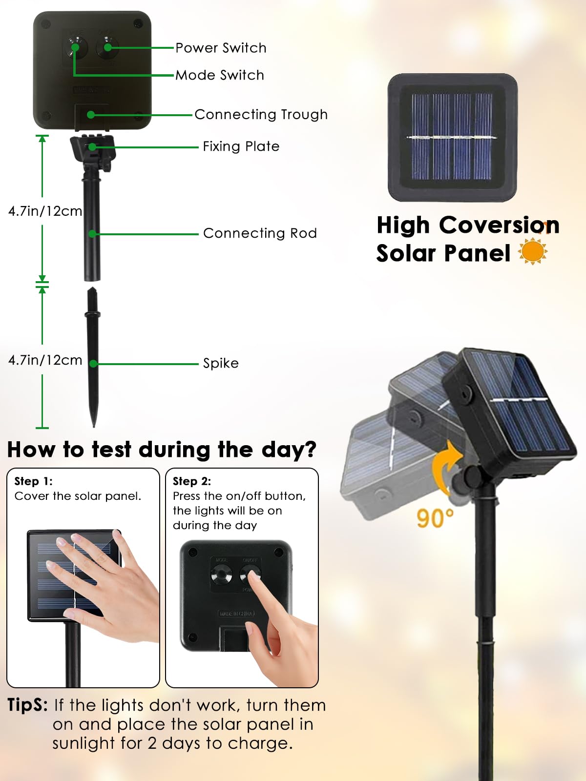 • 8 Modes and Memory Function: These solar twinkle lights feature an ON/OFF button and a mode button located at the back of the solar panel. You can select 8 different modes to satisfy your diverse needs by pressing the mode button. And the built-in memory chip saves your last modes setting, so there is no need to reset it