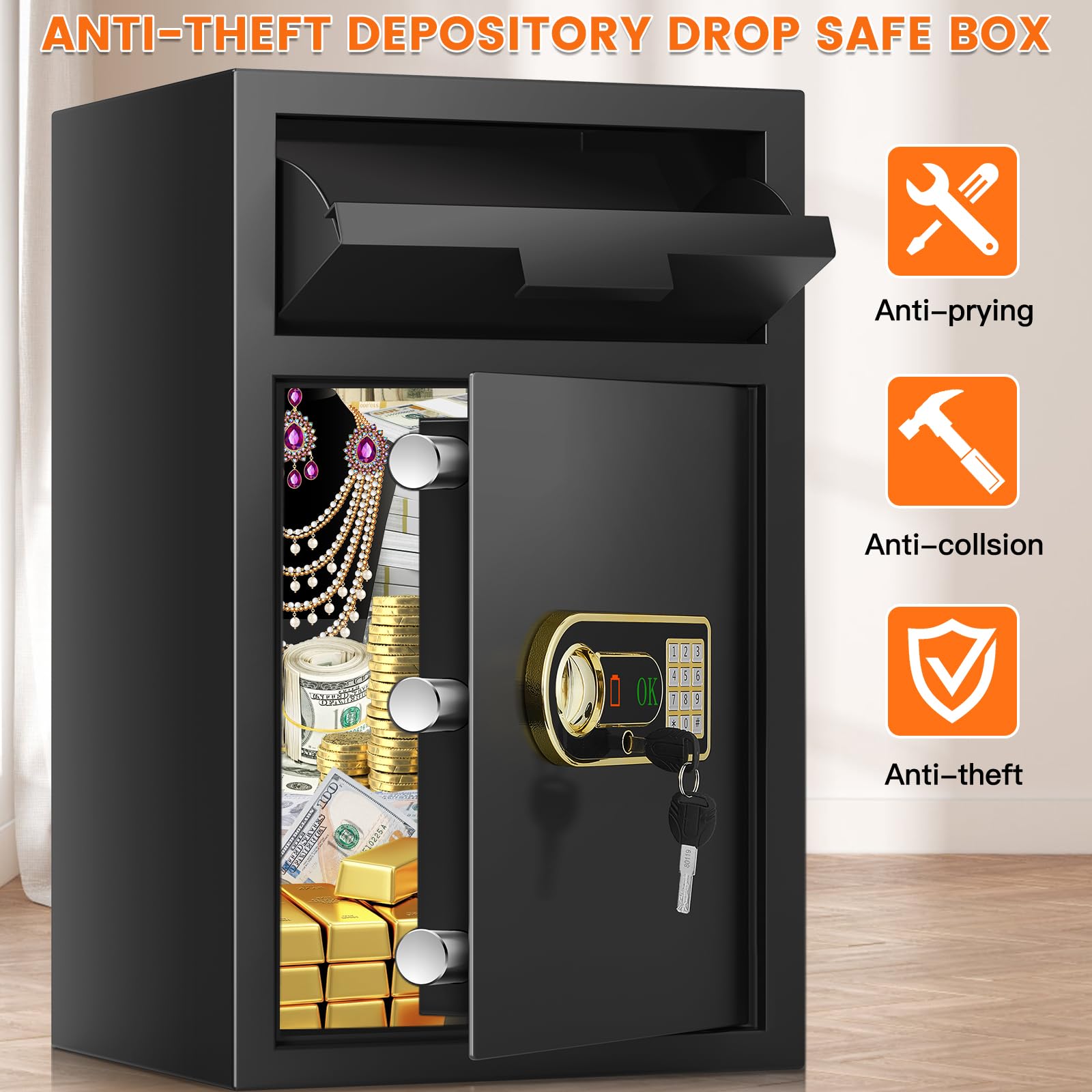 • EXTRA LARGE CAPACITY DROP SLOT SAFE FOR BUSINESS: 5.8 cubic Large capacity drop slot safes provide a generous amount of space for storing valuable assets and belongings, such as large bills, cash deposit folders, valuables, money, check, files and much more. The business safe is a perfect choice for retail store, small business, hotel, office, home any cash-business. Because of the security drop box at the front makes it easy to just drop in things without having to open the entire safe