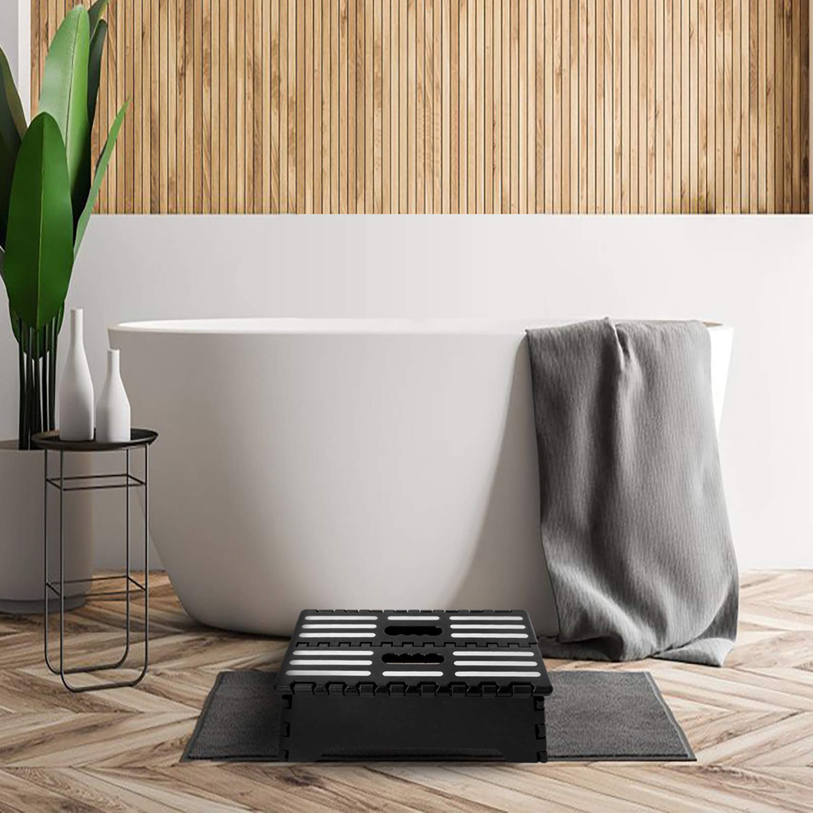 • 【Material】 The top of the portable fold down step has a rubber coating, which helps people maintain a sturdy footing while using the step,Made of high quality plastic, durable and environment friendly