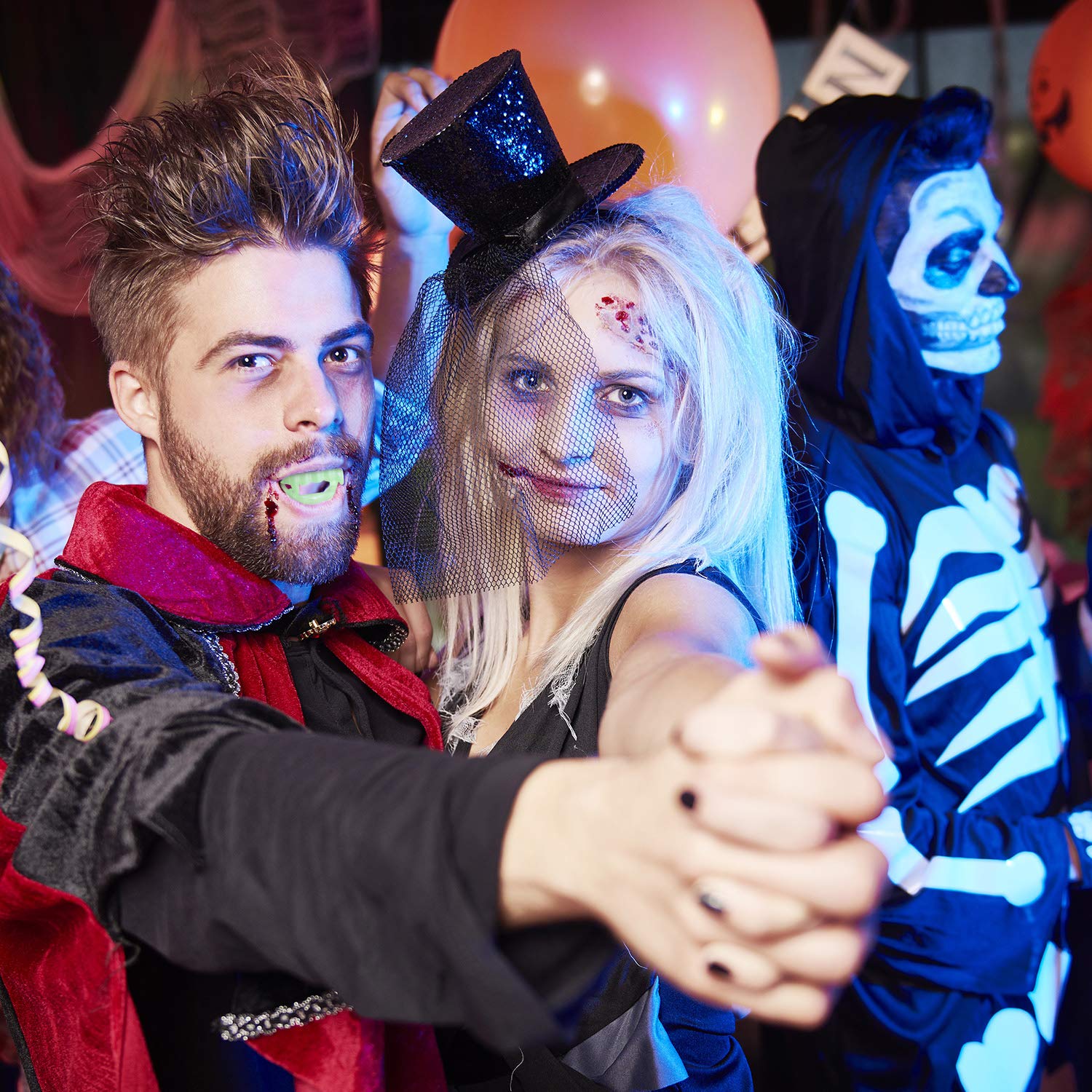 Glowing dentures: The soft neon teeth can be luminous, turn off the light and watch them glow in the dark, these teeth will make you looks very horrific, these fangs give vampire costumes a new look, you will have an unforgettable party.