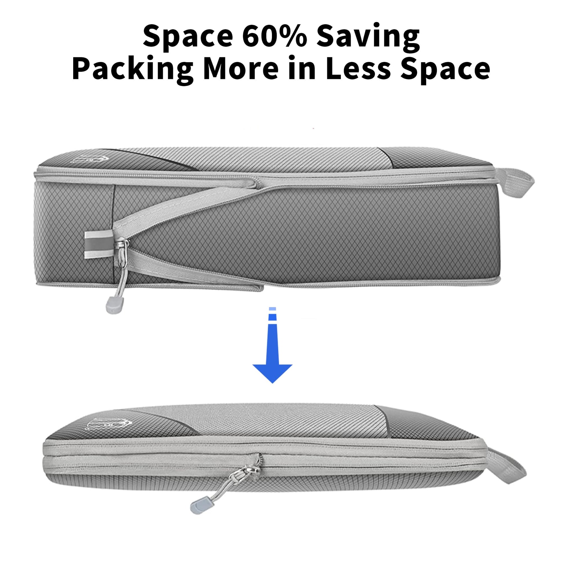 • 【Compressing Design】There Is an extra zipper outside of our compression packing cubes, be zipped up to work perfectly in compressing clothes to help save space in your travel backpack. Steps:1) fold your clothes and flatten them 2) pack clothes in cubes and zip the normal zipper. 3) Zip up the extra zipper to compress the packing cubes.