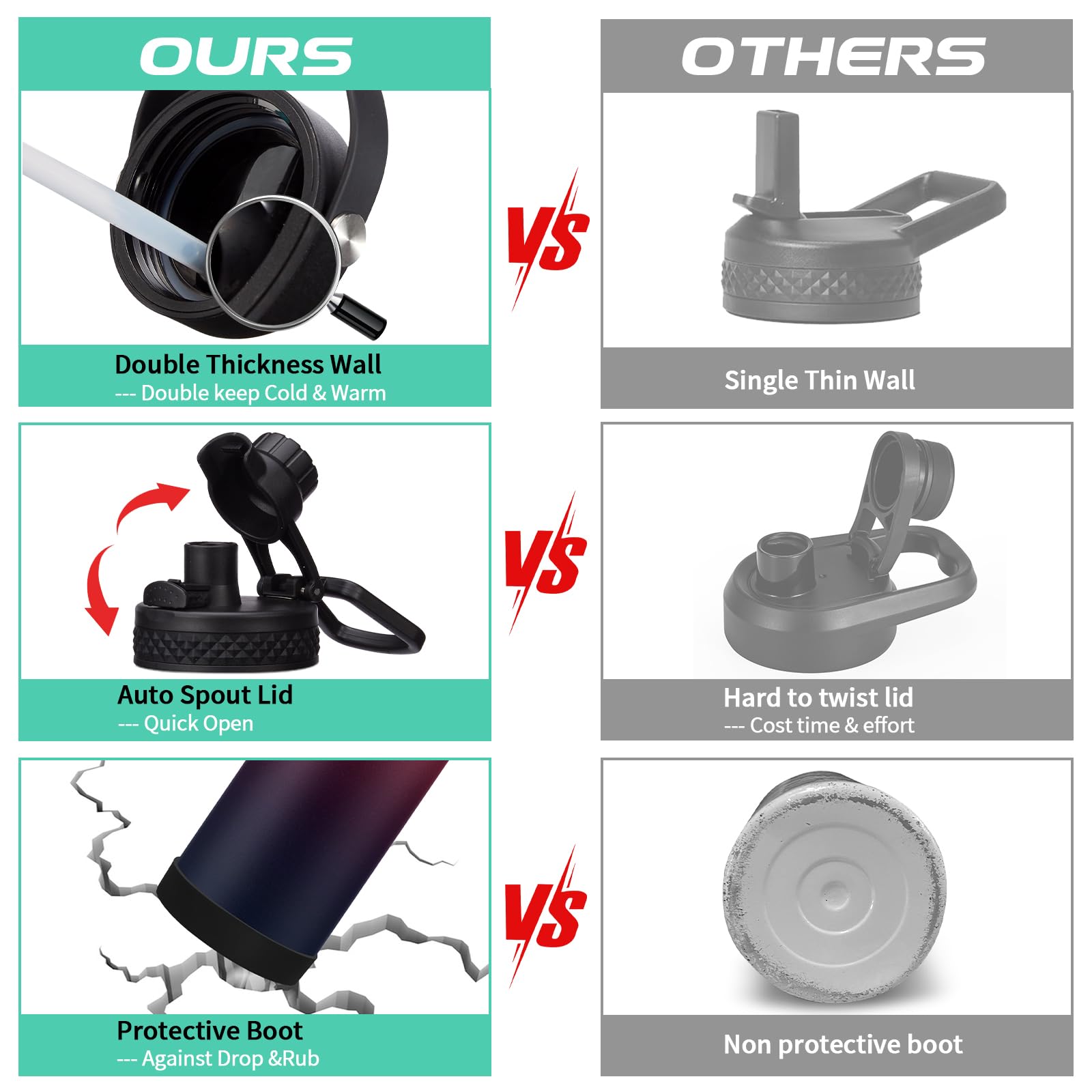 • 2 LID OPTIONS (Auto-spout & Straw): two different lids are complete LEAK PROOF & design for easy drink. The pops-up lid for easy drinking and seals shut for no leaks when you're on the go. The straw lid makes it easy to enjoy spill-proof sips, and package come with a alternative straw & a straw brush for easy cleaning