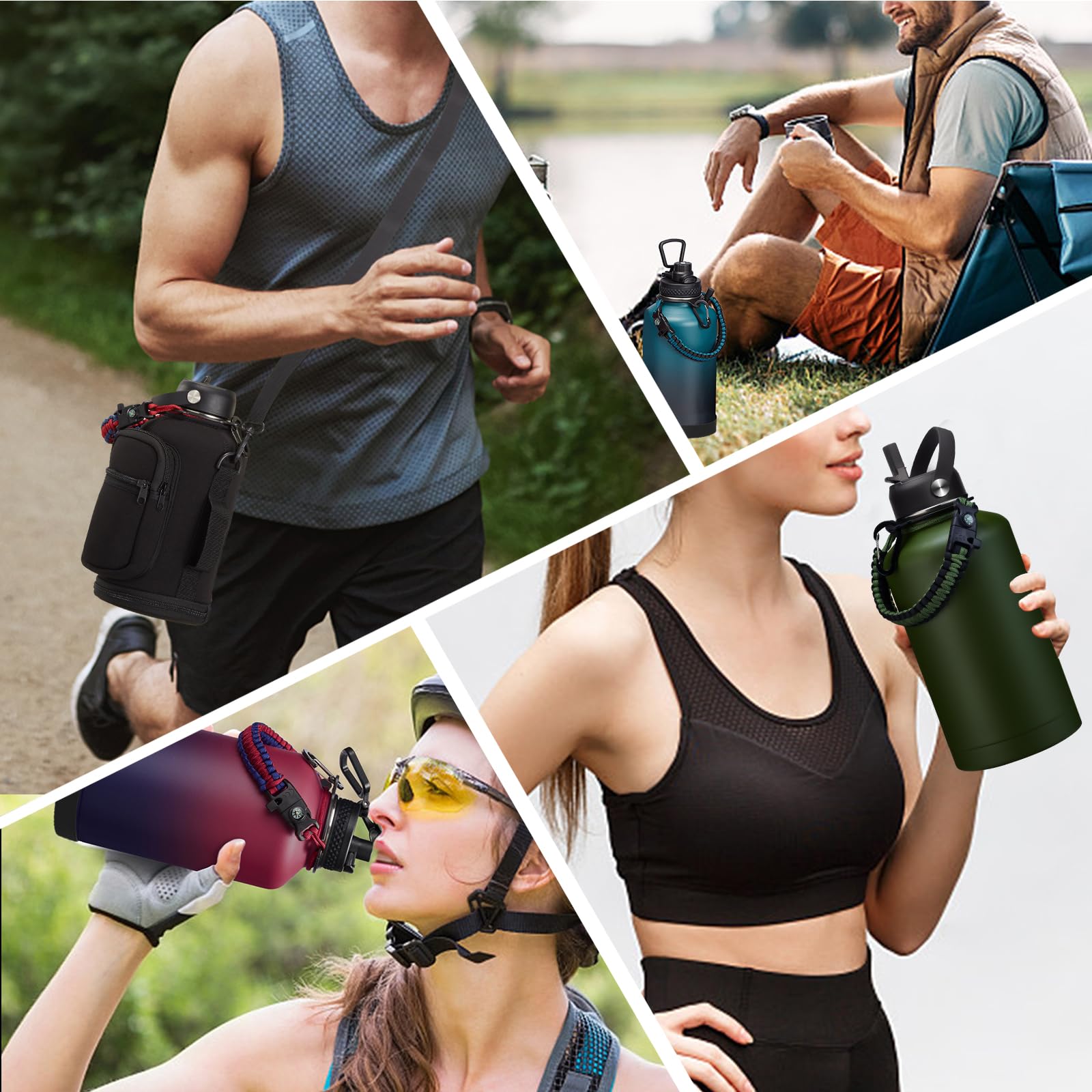 64oz Insulated Water Bottle with Straw & Auto Spout Lid - (Cold 48H & Hot 24H) Half Gallon Stainless Steel Water Jug with Paracord Handle, Metal Tactical Military Water Flask with Carrier Strap Bag