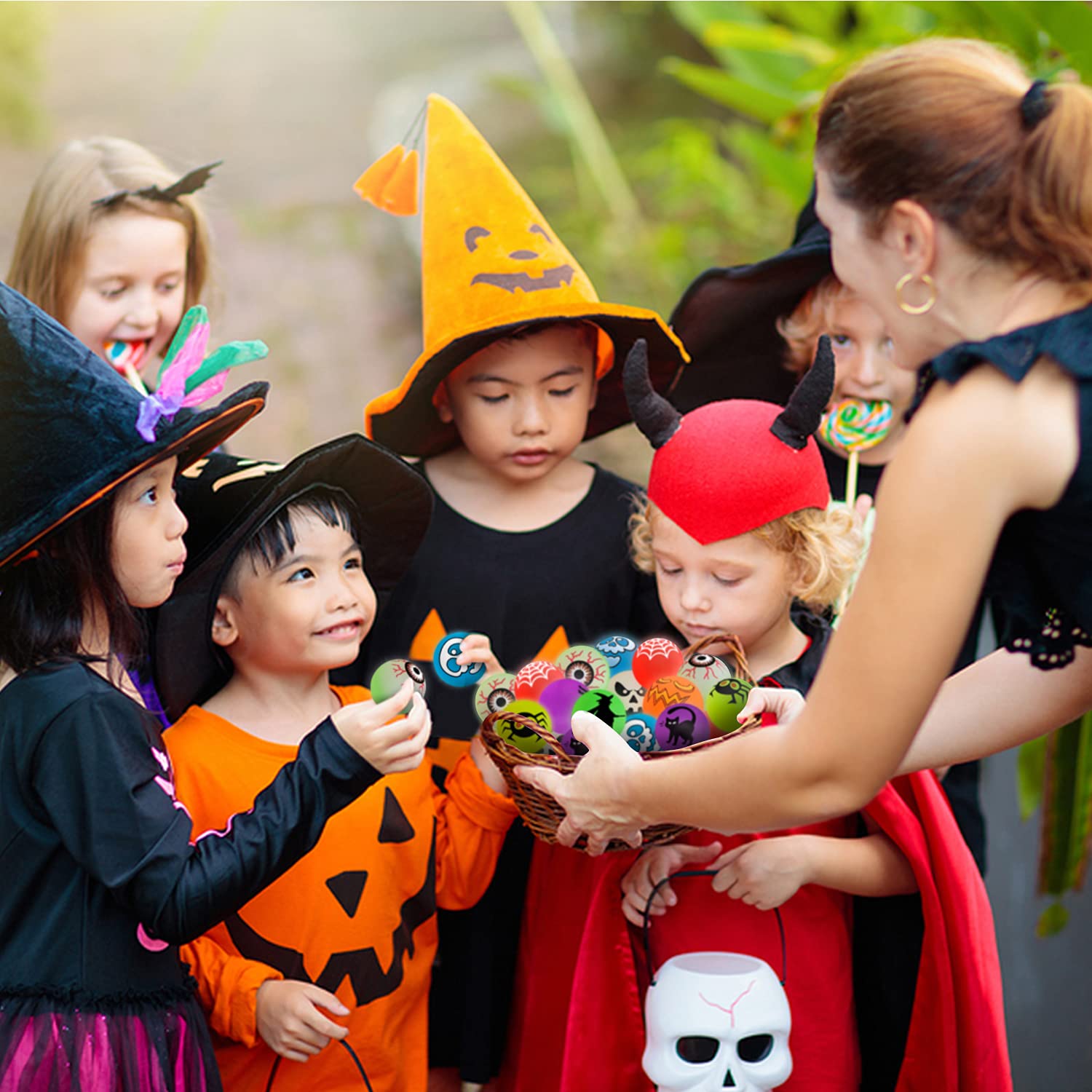 • Ideal Halloween Toys Assortment. Kids love having something to choose from rather than a bowl of candies.The classic Halloween-type designs,which is scary but funny and will glow in the dark, adding kind of spooky atmosphere during night. The kids will definitely love it.All eyes will be on these Glow Bounce Balls!