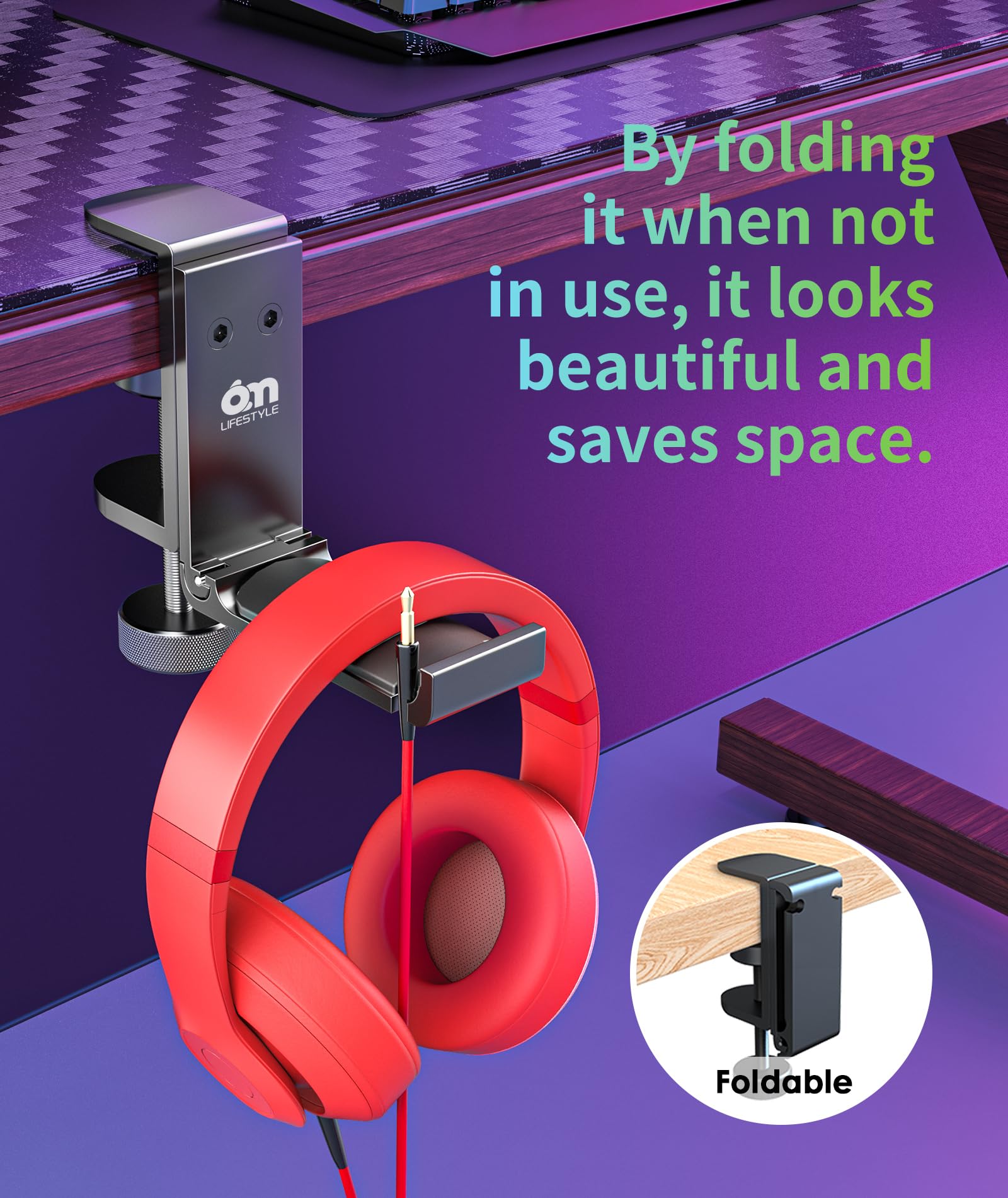 6amLifestyle Foldable Headphone Hodler Hook Hanger Stand Under Desk, Headphone Wall Mount with Cable Organizer Save Space Metal, Headset Holder Clamp for Headphones Gaming PC Headsets, Purse Handbag