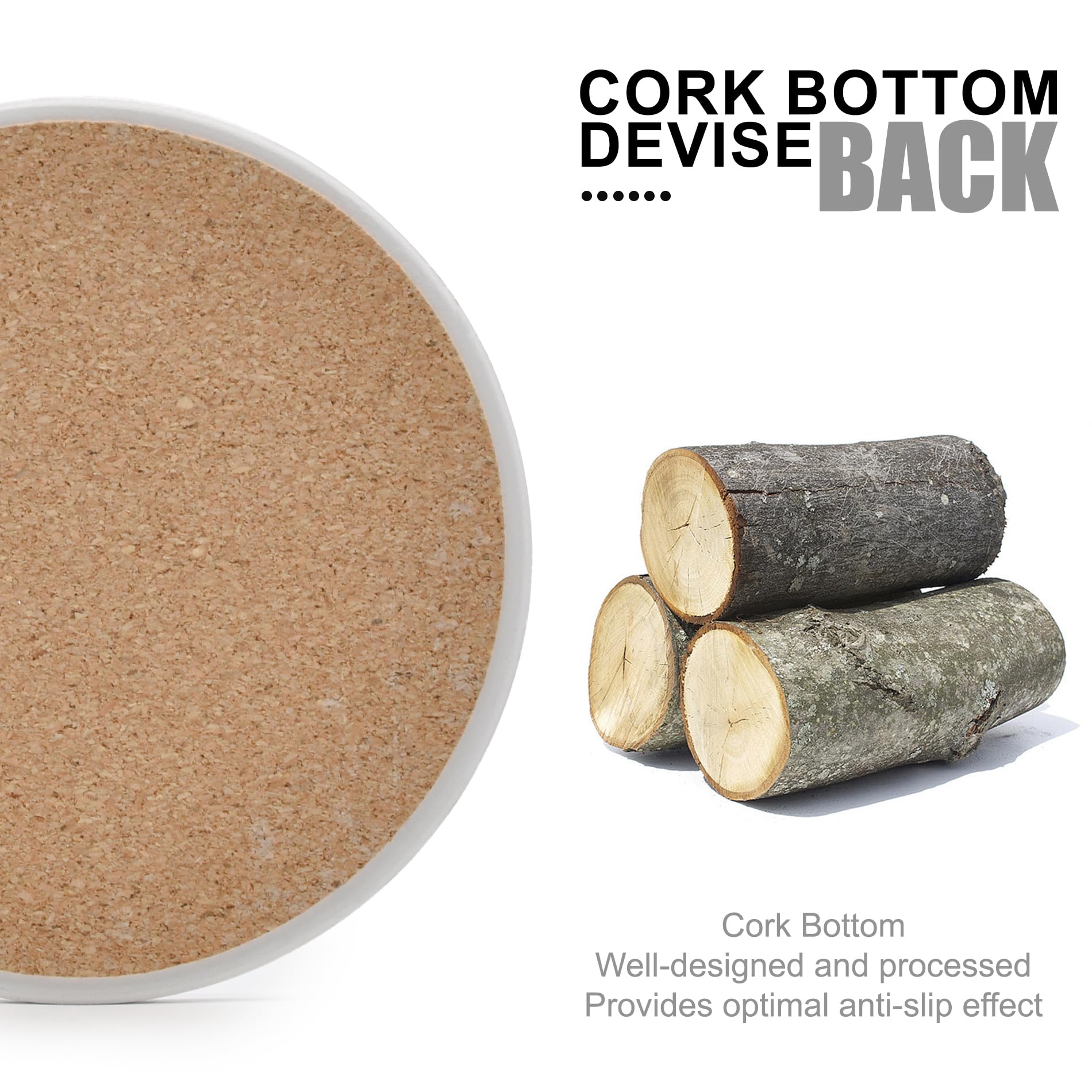 • 【Non-Slip Bottom】: Each ceramic coaster is equipped with a cork back pad, can not only prevent table from worn and scratched, but also make the coaster firmly attached to the desk