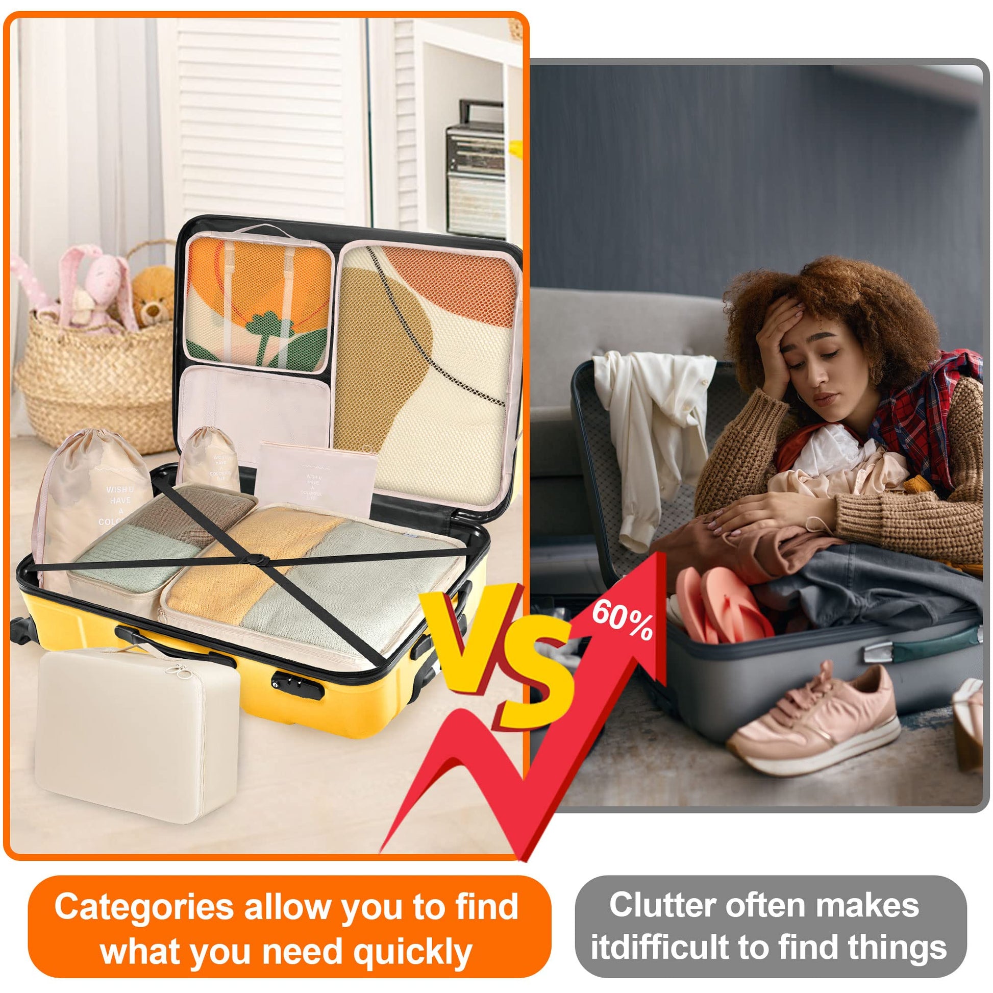• Quality Fabrics:Mesh top panel, easy to identify content and ventilate these cubes will go a long way. There are no broken zippers, no weak stitches. The smooth fabric protects your clothes from wrinkles and stains. High-performance features ensure that the packaging cube can withstand high-density wear during travel. The waterproof function protects your clothes from splashes or leaks.
