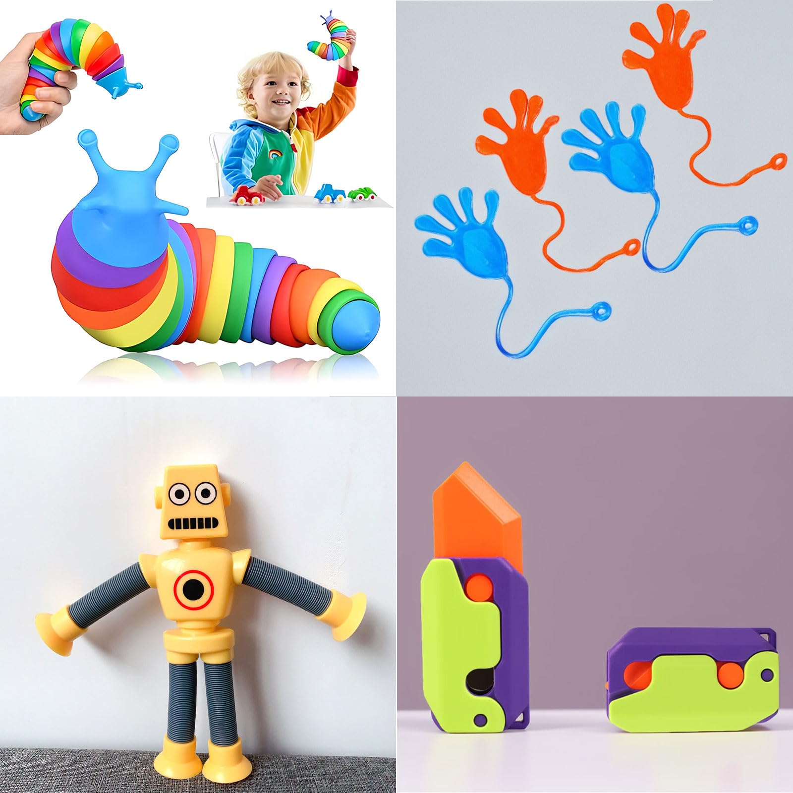 • 【Upgraded Bulk 80pcs Fidget Toy Pack】8 * Stretch Tube for Kid,2 * Push Bubble,1 *Mini Push Bubble,4 * Puzzle Balls,4 * Mesh and Marble,2 * Pop Bracelet,1 * Rainbow ball,1 * Speed Cube,3 * Animal Stretchy Strings,5 * Mochi Squishy Toy,4 * Finger Rings,2 * Wacky Tracks,8 * Stretchy Strings,2 * Snake Cube Twist Puzzles,10 * Mini Plush Massage balls,1 * 3D Maze Puzzle,1 * Robotics Fidget Tubes, 4 * Cute Stickers,1 * 3D Fidget Slug,2 * Sticky Hands,2*3D Printing Fidget Knife Toys,etc