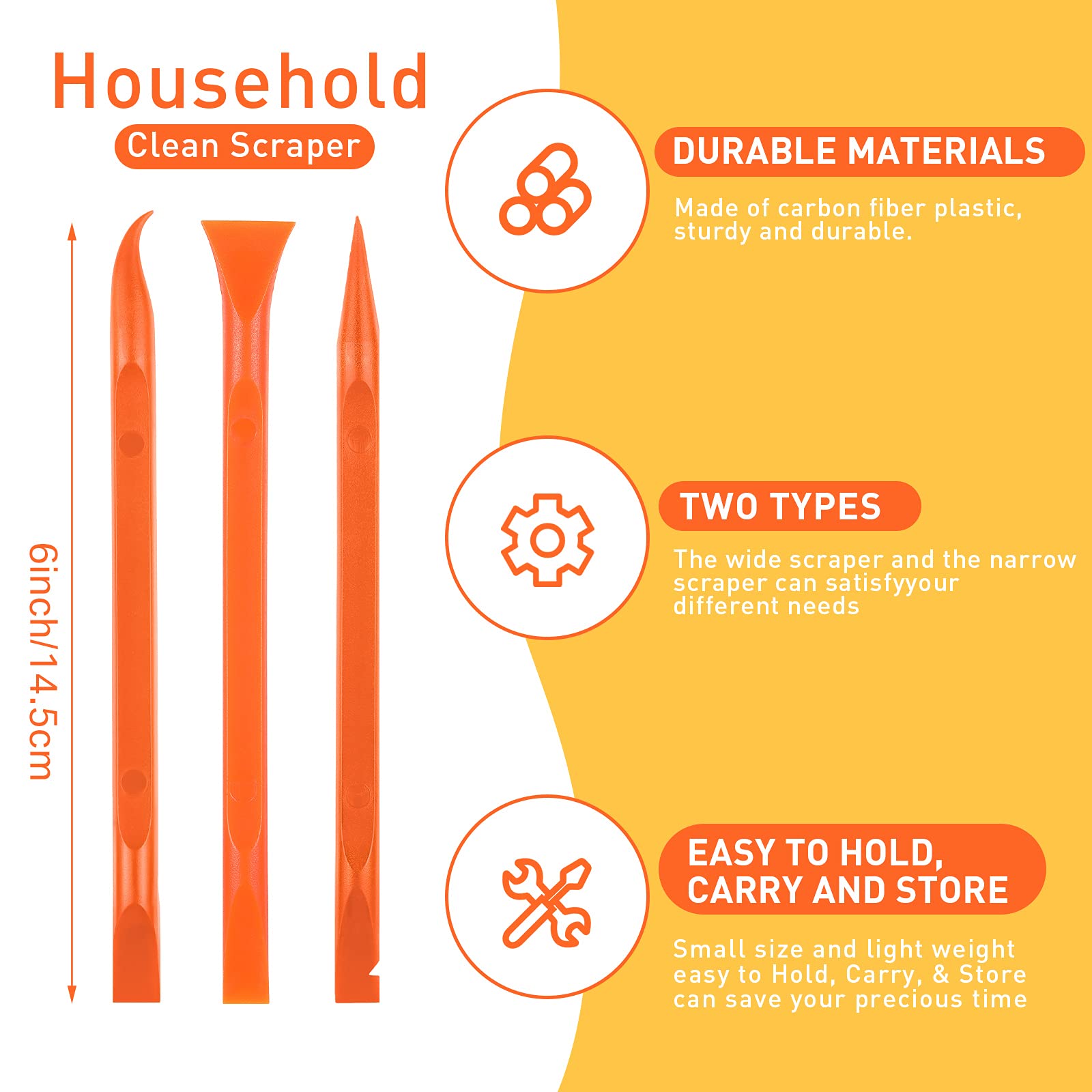 3 Kinds of two-way scraper tools: the 3 kinds of two-way scratch free plastic scrapers are proper for various occasions; The wide scraper head can be applied to scrape wide areas, such as smudges on the ground, chewing gum, stickers, labels, etc.; The narrow scraper head can clean narrow spaces, as well as difficult to reach places of the car outside body and interior place; And the pointed scraper is very suitable for cleaning more narrow crevices, such as tight corners, edges, grooves