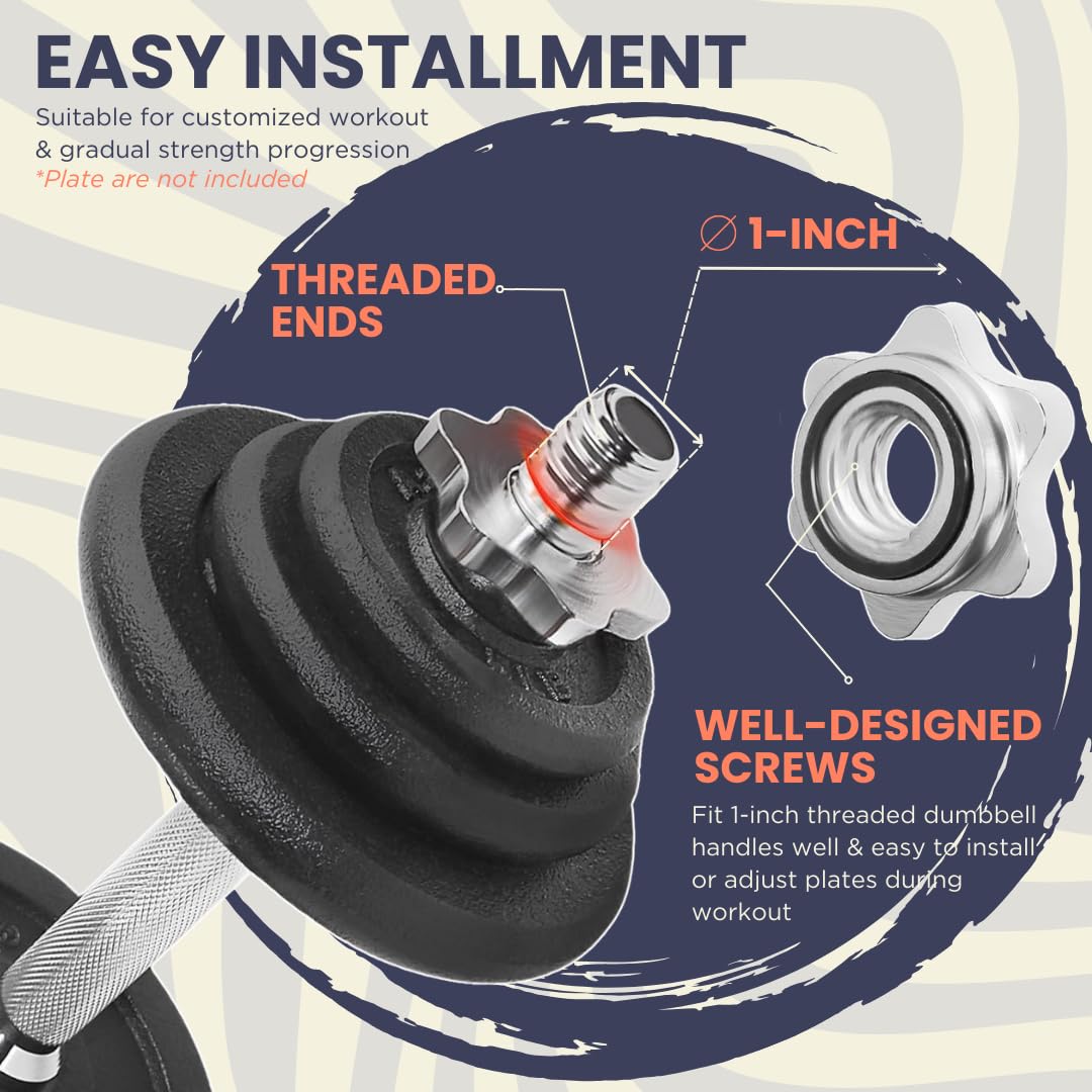 • EASY INSTALLATION & ADJUSTMENT - 4 star collars with WELL-DESIGNED SCREWS do a good job of fitting A2ZCare threaded dumbbell handles that make weight plate installation & adjustment process very easy. These dumbbell bars are very suitable for customized workouts & gradual strength progression.