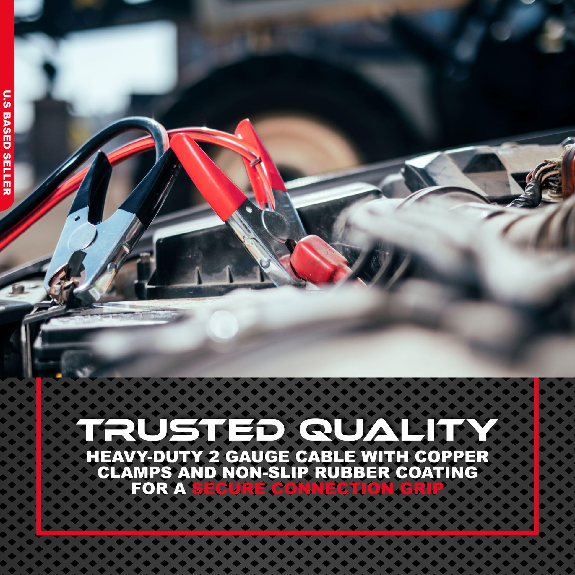 • BUILT TO LAST: Heavy-duty 2-gauge cable constructed with solid copper clamps to administer optimal contact; Serrated jaws; High-tension parrot clamps; Non-slip rubber coating offers a secure connection grip